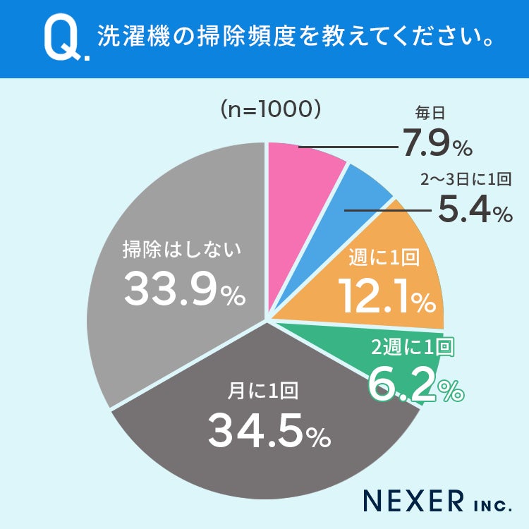 ■洗濯機の掃除頻度、34.5%が「月に1回」