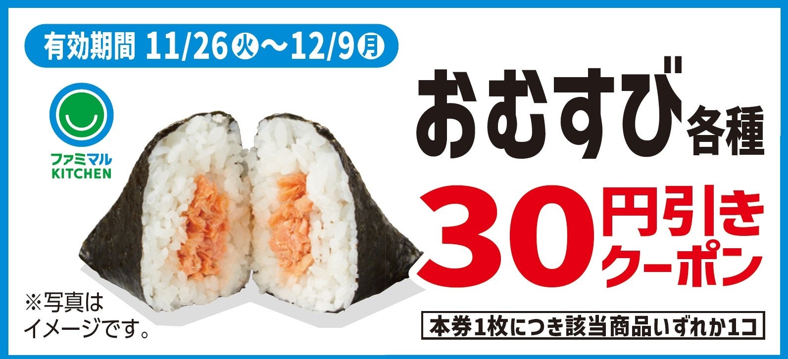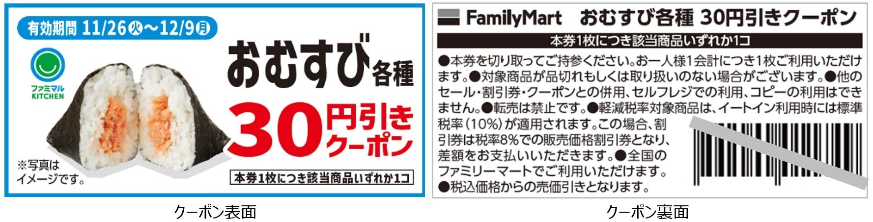 株式会社ファミリーマート(本社:東京都港区、代表取締役社長:細見研介)は、継続して取り組んでいる5つのキーワードの1つである「たのしいおトク」の一環として、おむすびやお弁当、サンドイッチ、スイーツなどご購入の際にご利用いただける「お買得クーポン」を2024年11月26日(火)から全国のファミリーマート約16,300店舗にて配布を開始いたします。