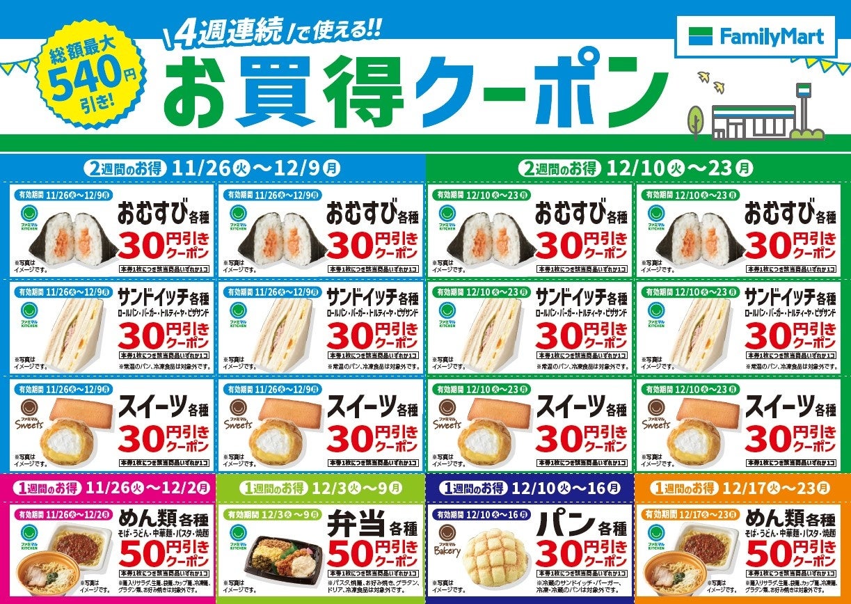 年末はファミリーマートがおトク!! 4週連続で使える!!お買得クーポンを店頭にて配布