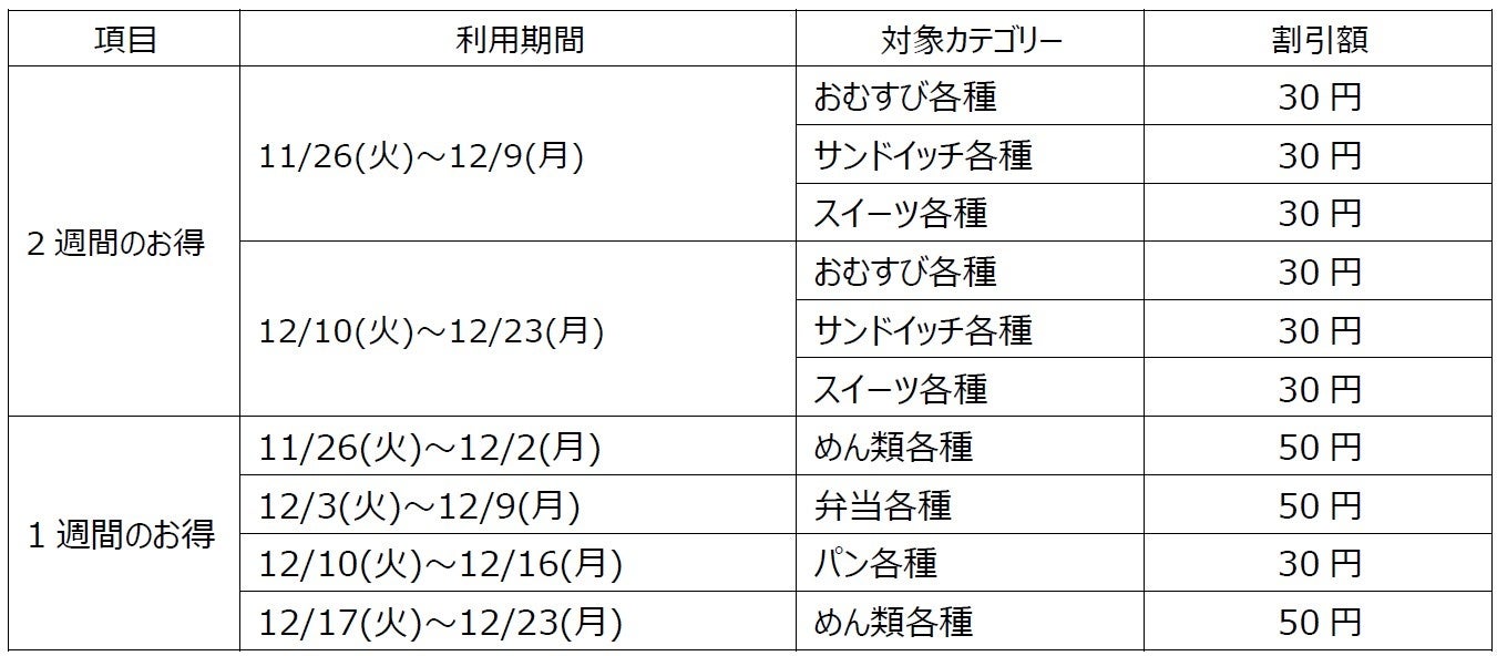 物価の高騰が続く昨今、多くのお客さまに楽しくおトクにお買い物を楽しんでいただきたいという思いから、おむすびやサンドイッチ、スイーツなどお買い求めいただく機会の多いカテゴリーを対象としております。