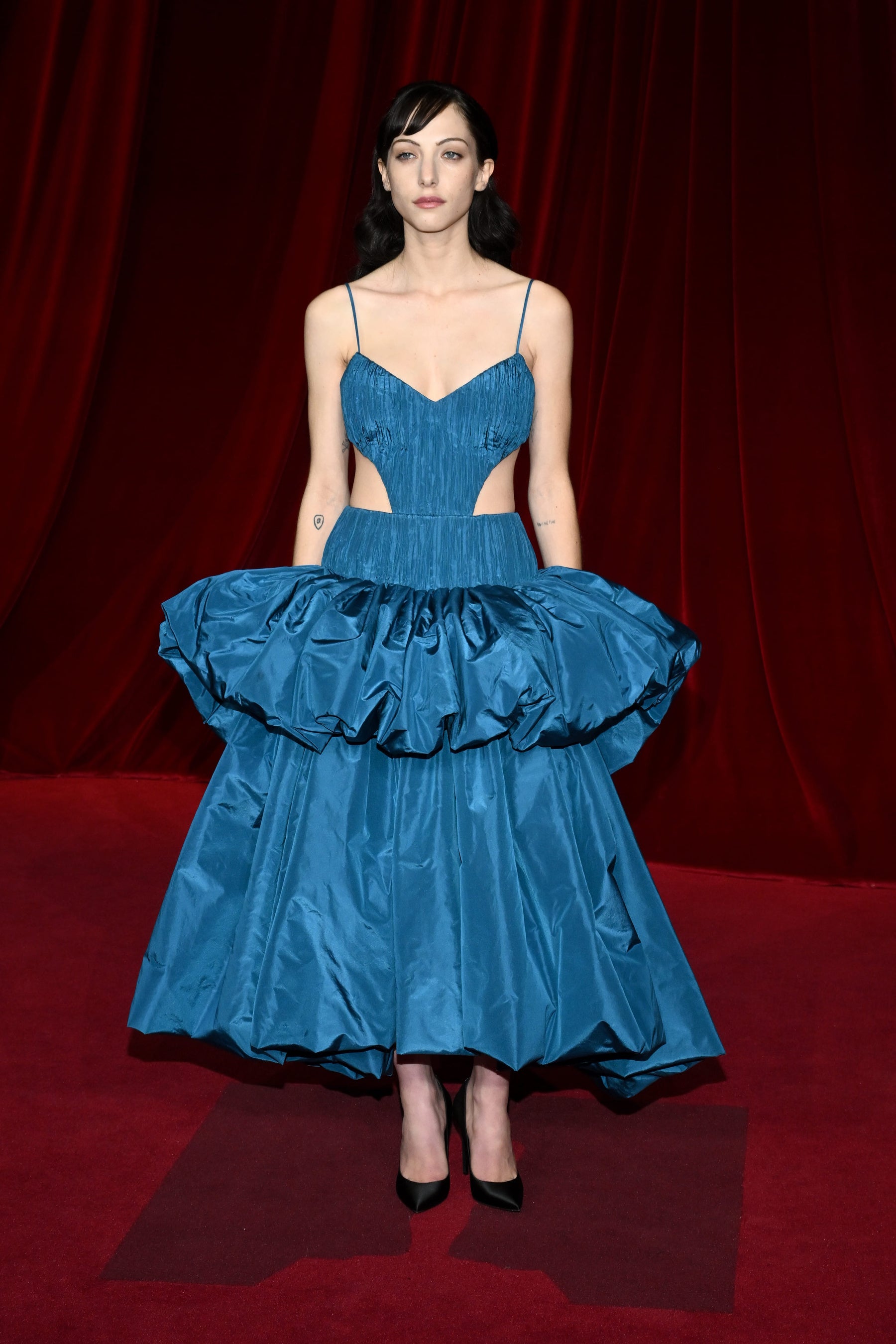 デヴォン·ロスは、ピーコックブルーのシルクタフタのカットアウトのディテールが施されたプリーツガウンに、ギャザーのたっぷり入ったスカート、ブラックのサテンパンプスを合わせました