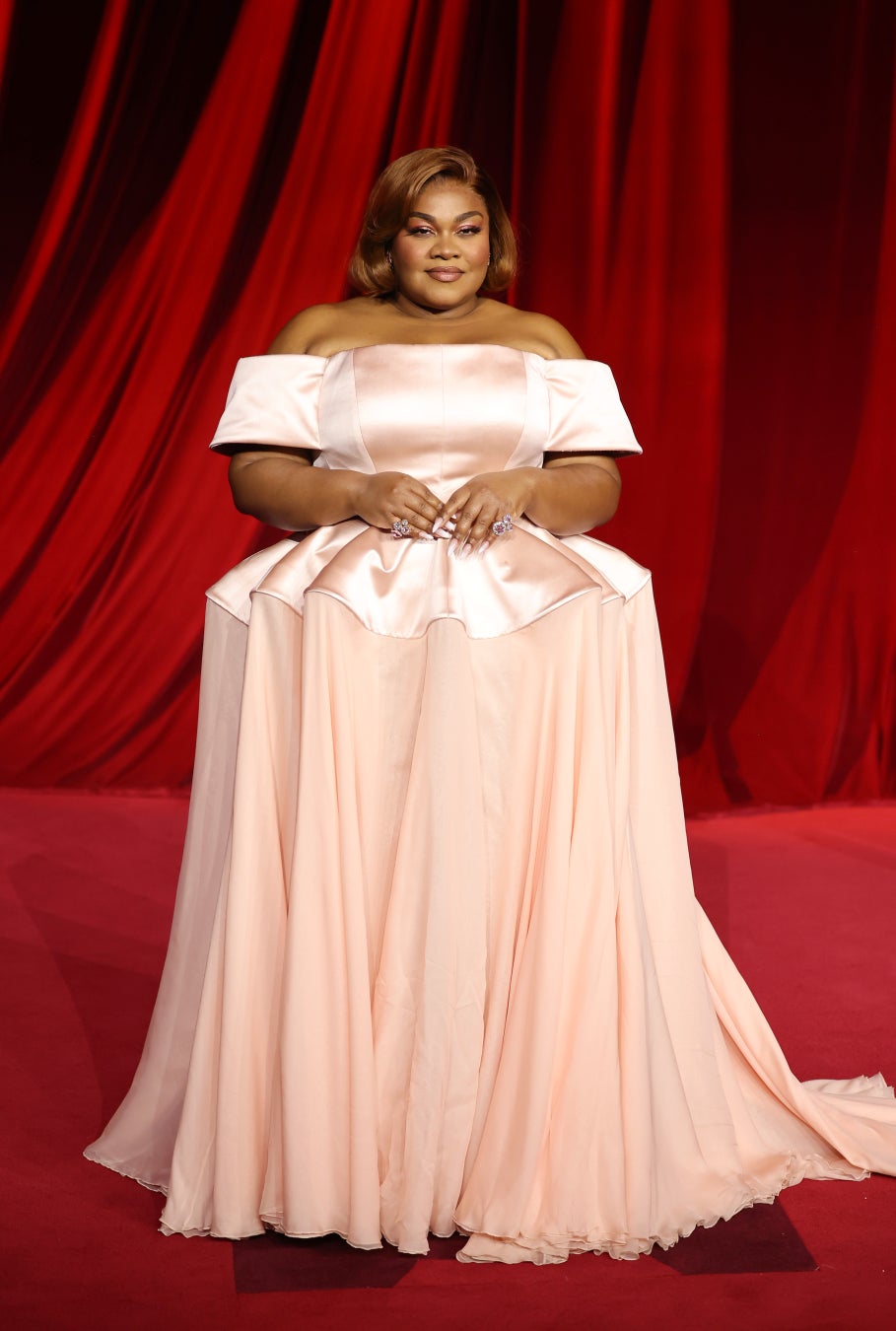 ダヴァイン·ジョイ·ランドルフは、ピンクのオフショルダーダブルレイヤーシルクガウンに3Dプリーツスカート、を着用しました。