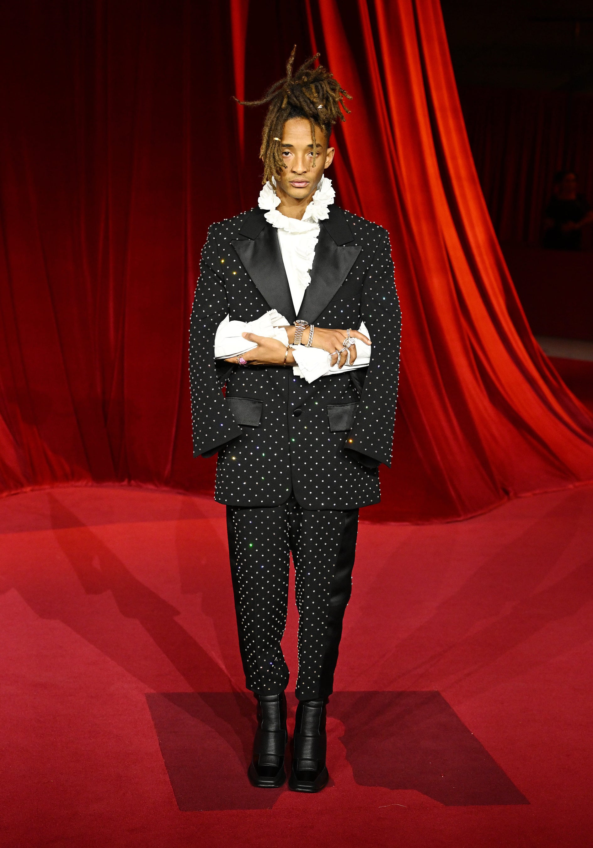 ジェイデン·スミスは、ブラックのウールストラス刺繍が施されたスーツ、ホワイトラッフルハイネックシャツ、ブラックのレザーブーツを着用しました。