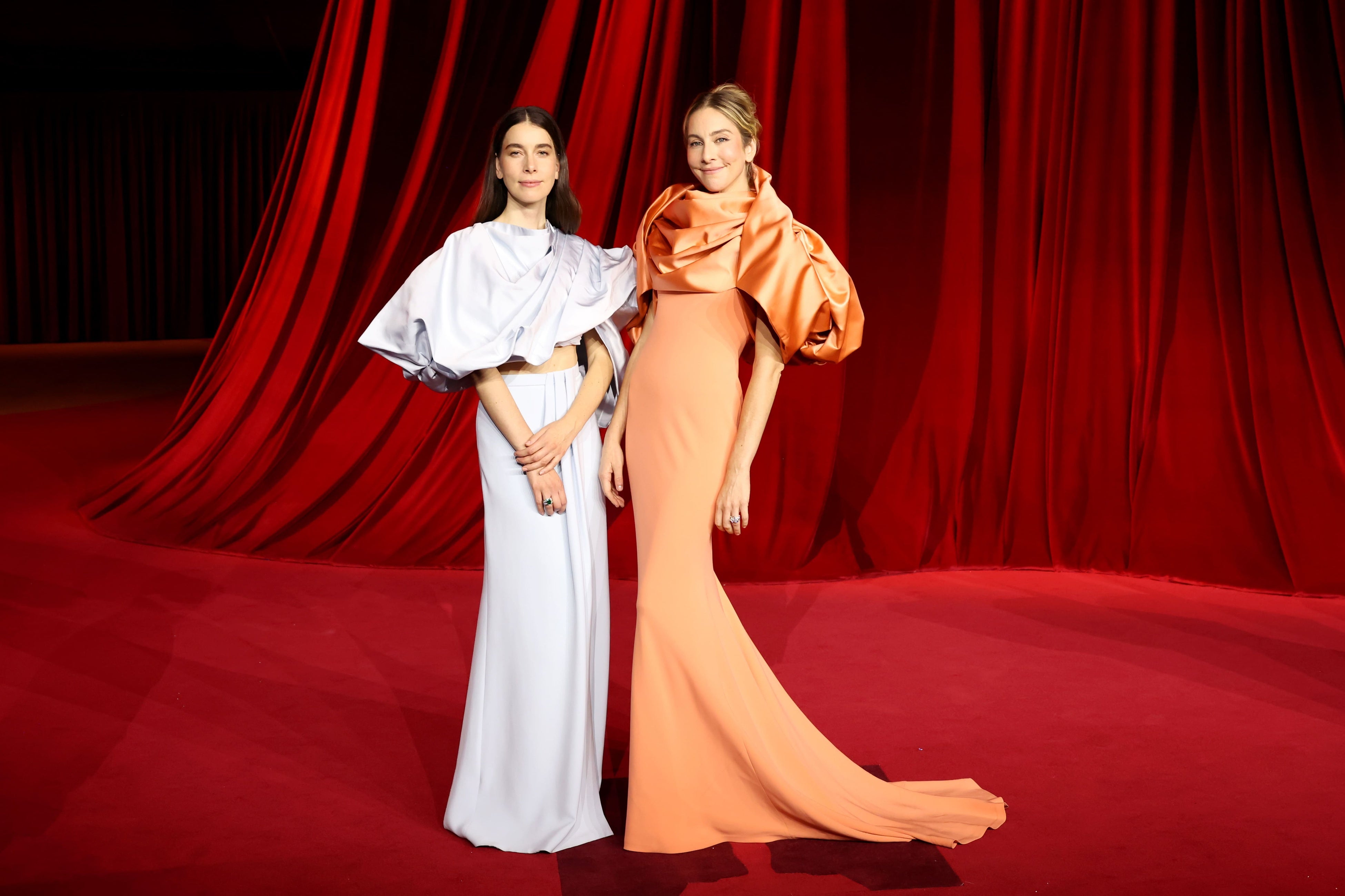 ダニエ·ハイムは、パステルブルーのシルクのプリーツケープにハイウエストのラップスカート、シルバーのサンダル。また、メゾンのハイジュエリー「ディープ タイム」より、4.73カラットのオクタゴナルカットのエメラルドとダイヤモンドをあしらったリング「ゴンドワナ」を着用しました。エステ·ハイムは、テラコッタのシルククレープのスリーブレスガウンにシルクのクロップドプリーツケープ、シルバーのサンダル。また、メゾンのハイジュエリーコレクション「ブレイヴァリー」より、ダイヤモンドとホワイトゴールドに3.01カラットのLV モノグラムスターカットダイヤモンドをあしらったリング「ラ・スタール・デュ・ノール」を着用しました。
