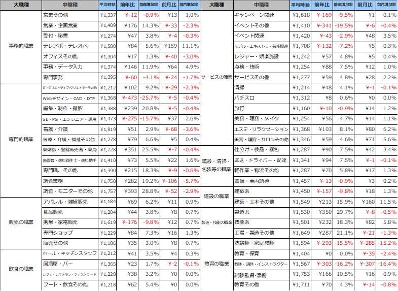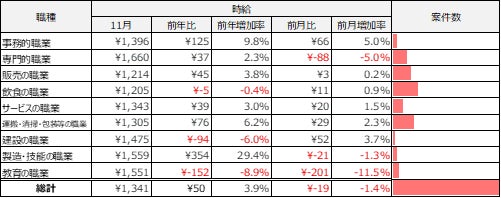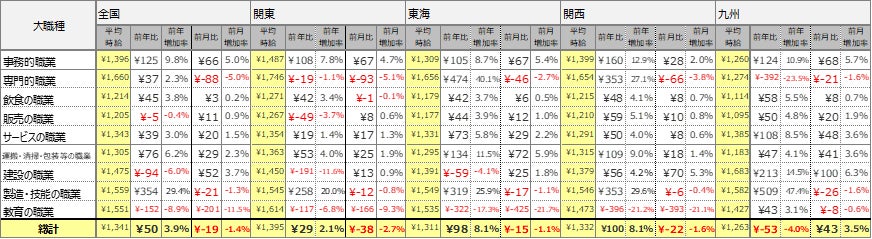 事務的職業は1,396円(前年比125円増、前月比66円増)、専門的職業は 1,660円(前年比37円増、前月比88円減)、飲食の職業は1,214円(前年比45円増、前月比3円増)、販売の職業は1,205円(前年比5円減、前月比11円増)、サービスの職業は1,343円(前年比39円増、前月比20円増)、運搬・清掃・包装等の職業は1,305 円(前年比76円増、前月比29円増)、建設の職業は1,475円(前年比94円減、前月比52円増)、製造・技能の職業は1,559円(前年比354円増、前月比21円減)、教育の職業は1,551円(前年比152円減、前月比201円減)となりました。