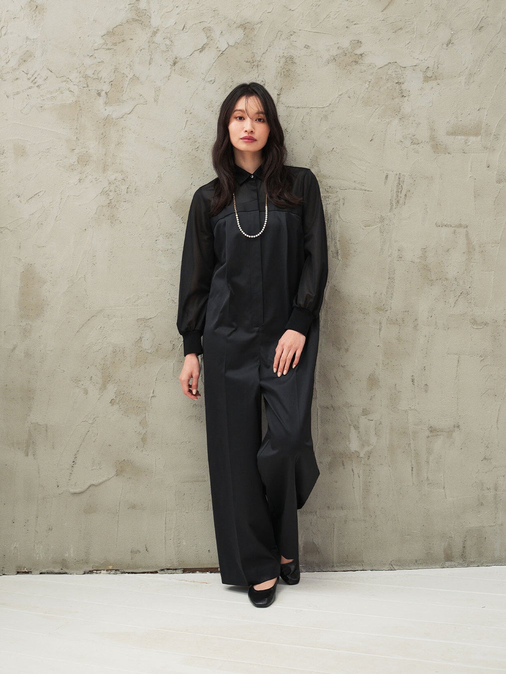 今っぽいシルエットが、一枚で完成する、レイヤードスタイル風のオールインワン。スリーブや肩のラインはシアー素材で、ヘルシーな肌見せにトライしてみて。