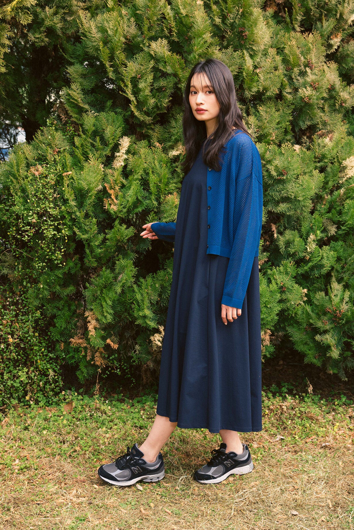 ドレープが美しいワンピースに、コンパクトなメッシュカーディガンを重ねて。ネイビーとブルーの重なりが、繊細なニュアンスを生む。