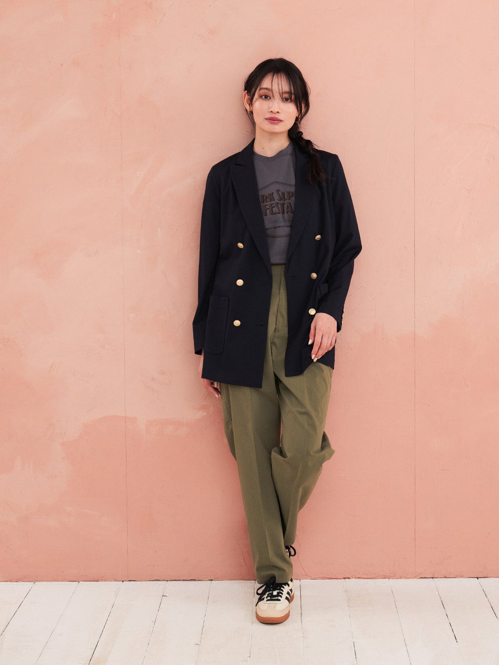 プリントTにカーキのベイカーパンツ。王道カジュアルスタイルに、上質なカットソー素材のブレザーで女性らしさをプラス。メンズはよりミニマルに、洗練された着こなしを提案。