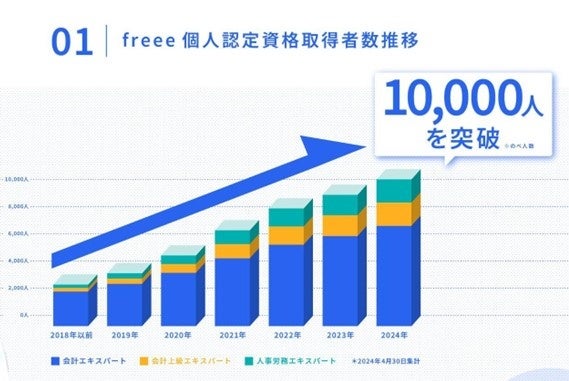 freee会計を活用できる会計士・税理士の人材を増やすため、freee会計の活用スキルを証明する資格制度を2018年に開始し、それ以降資格取得者は伸び続け2024年に10,000人を突破しました。