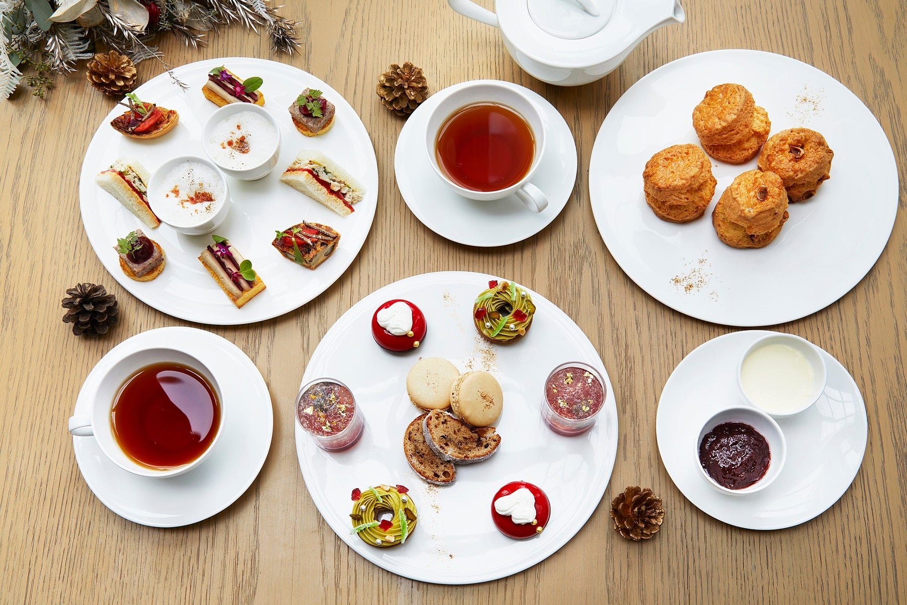 心躍る季節の到来を告げるクリスマスのモチーフが印象的なフェスティブ アフタヌーンティー。サンタクロースの白い髭が赤いグラサージュに映えるラズベリームースに、クリスマスリースを模ったピスタチオケーキ、定番のシュトーレンといった5種類のスイーツ、そしてセイボリーには、フォアグラムースやパテドカンパーニュ、かぶのフランなど、祝祭にふさわしいごちそうをイメージした5種類が揃います。黄金色に輝くシャンパンと共にぜひお愉しみください。
