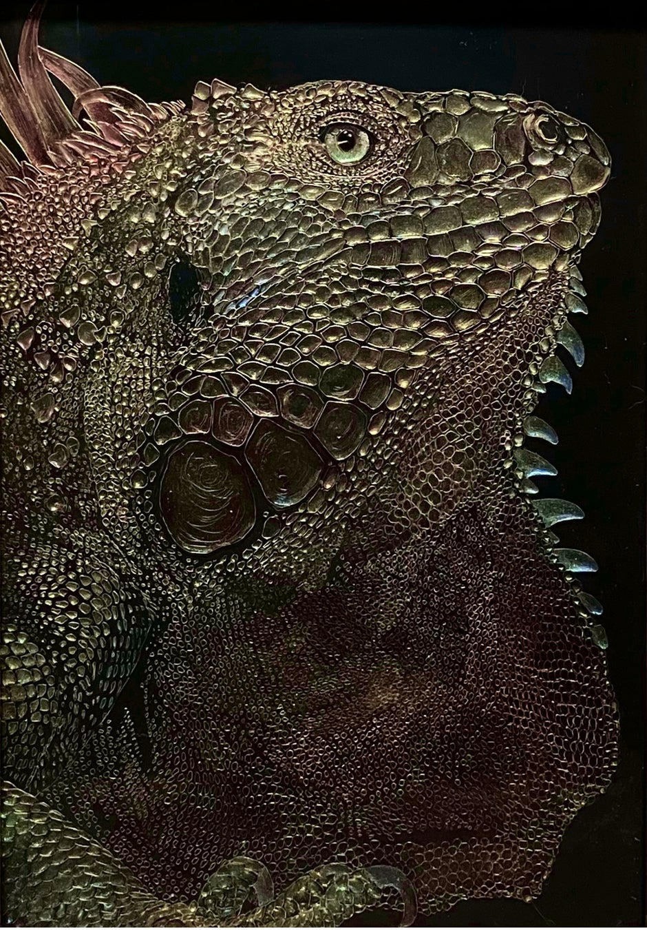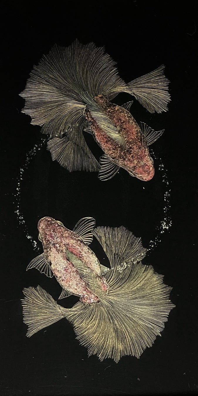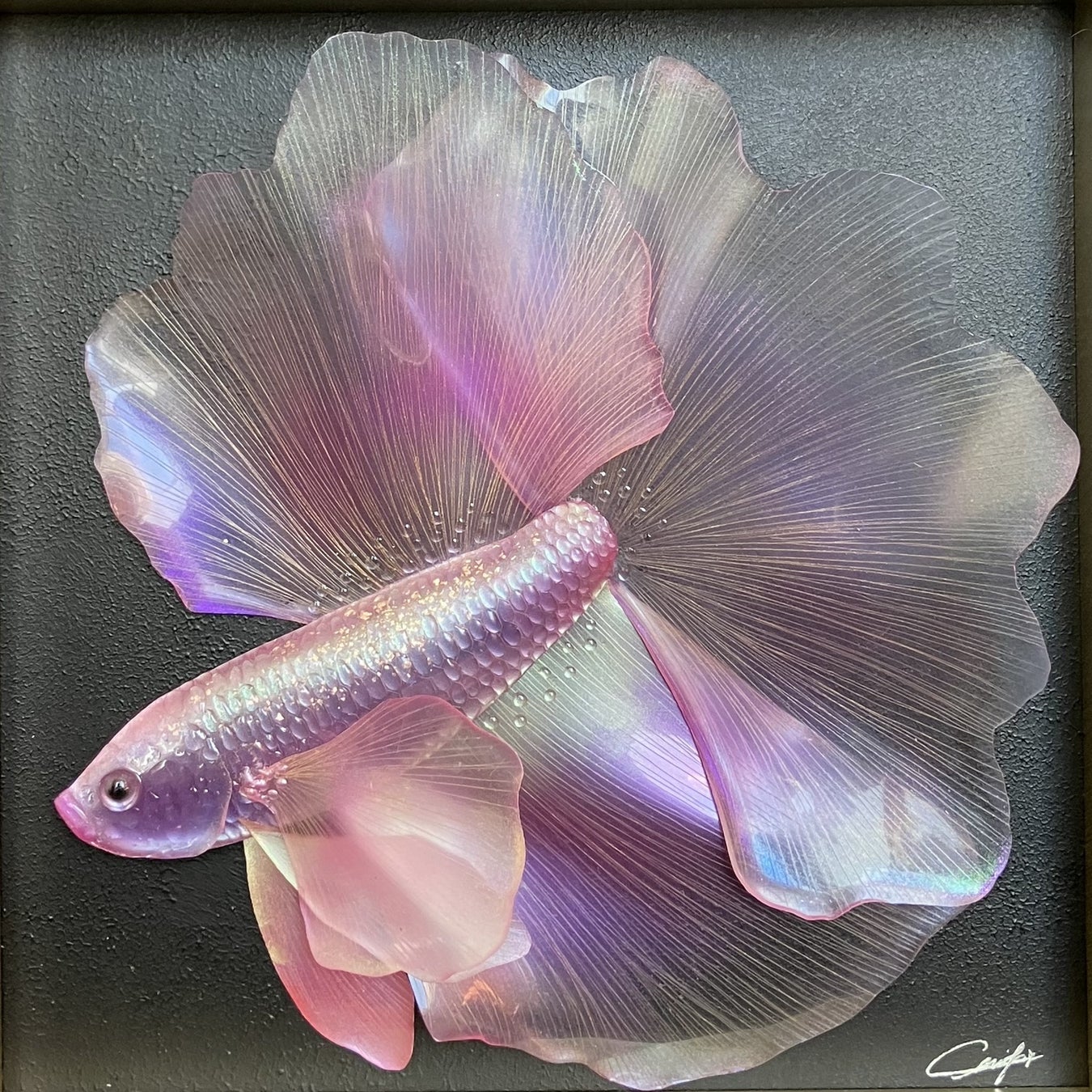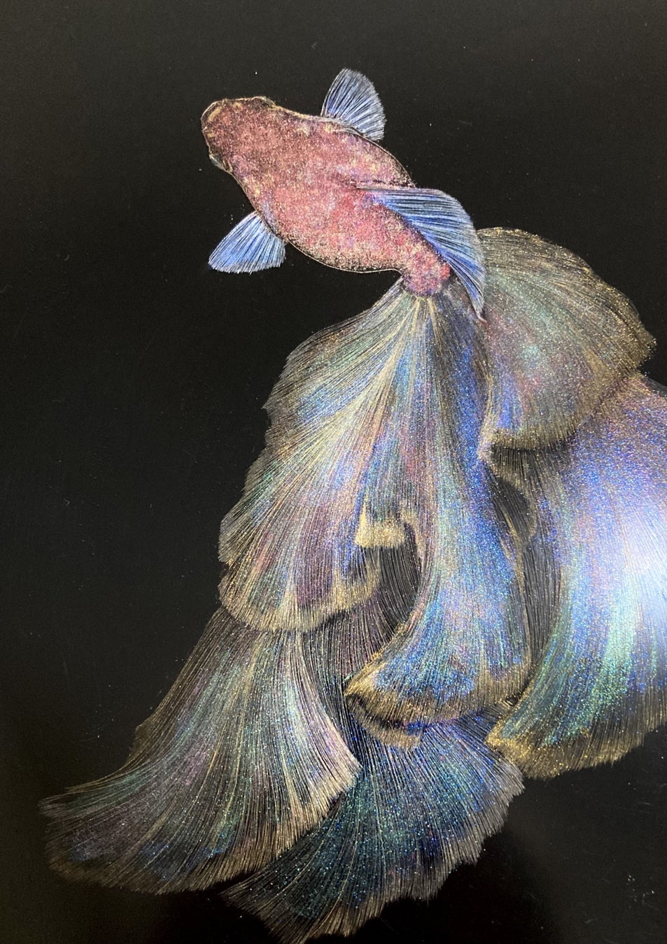 「たった1枚の美しい羽を作りたい」という衝動から生まれたこの技法は、版画の技法を用いて透明樹脂(レジン)に線画や彩色を施し、美しい生き物たちを平面・立体の垣根を越えて表現しています。版画が紙に転写されるのに対し、水咲氏の作品は液状の樹脂を硬化させた「レジン」がそのままアートとなります。細密な線描写や羽の一枚一枚に施された線は、版板を削り、色とレジンを詰めることで生み出されたものです。この独創的な技法により、羽や鱗をリアルに再現した半立体作品や、螺鈿細工や蒔絵を思わせる平面作品が誕生しました。