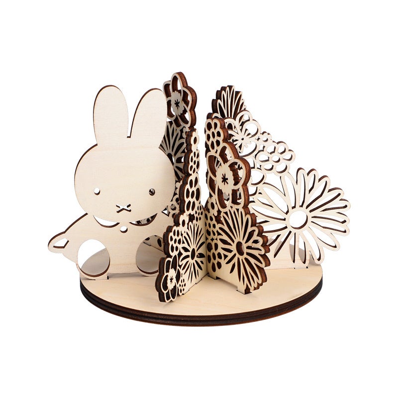おすわりしたミッフィーとお花のカットが印象的な木製の一輪挿しです。アートフラワーのカーネーションアレンジがセットになっています。各方面から見えるデザインが異なり、360度楽しめるアイテムです。パーツを取り外して、コンパクトに収納も可能です。