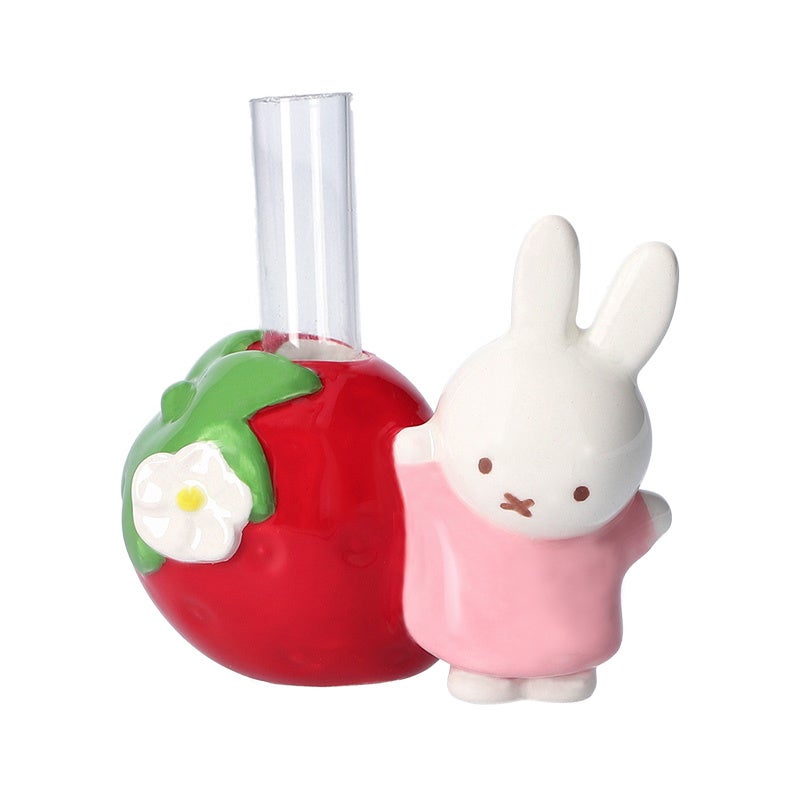 おおきないちごの側で、手を上げているミッフィーがかわいらしい陶器の一輪挿しと、カーネーションとガーベラのアートフラワー2本のセットです。ミッフィーがまるで、大きないちごにびっくりしているようなデザインの一輪挿しは、高さ8cmほどの手のひらサイズでデスクやキッチンなどお部屋のインテリアとしてもお楽しみいただけます。ガラス管は取り外し可能で、ペン立てとしてもお使いいただけます。