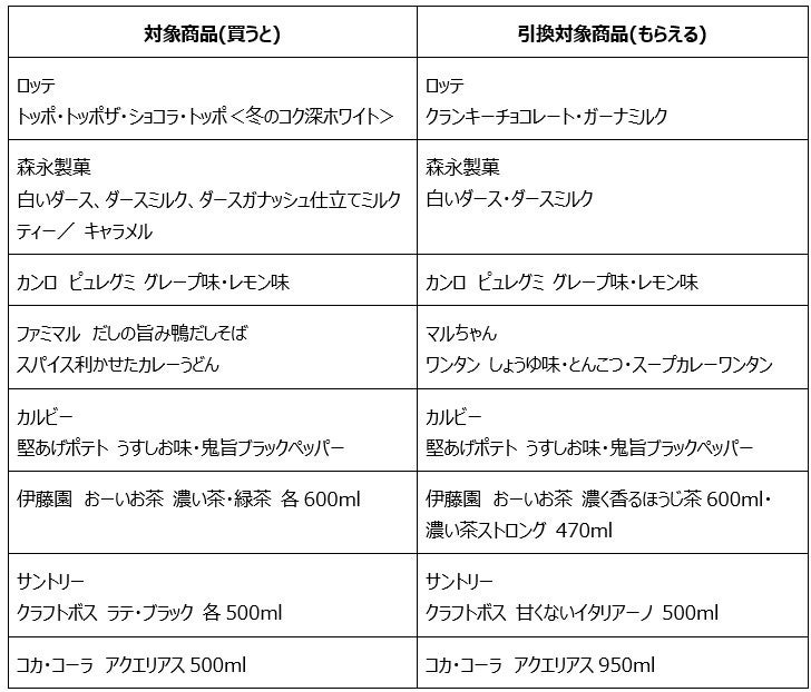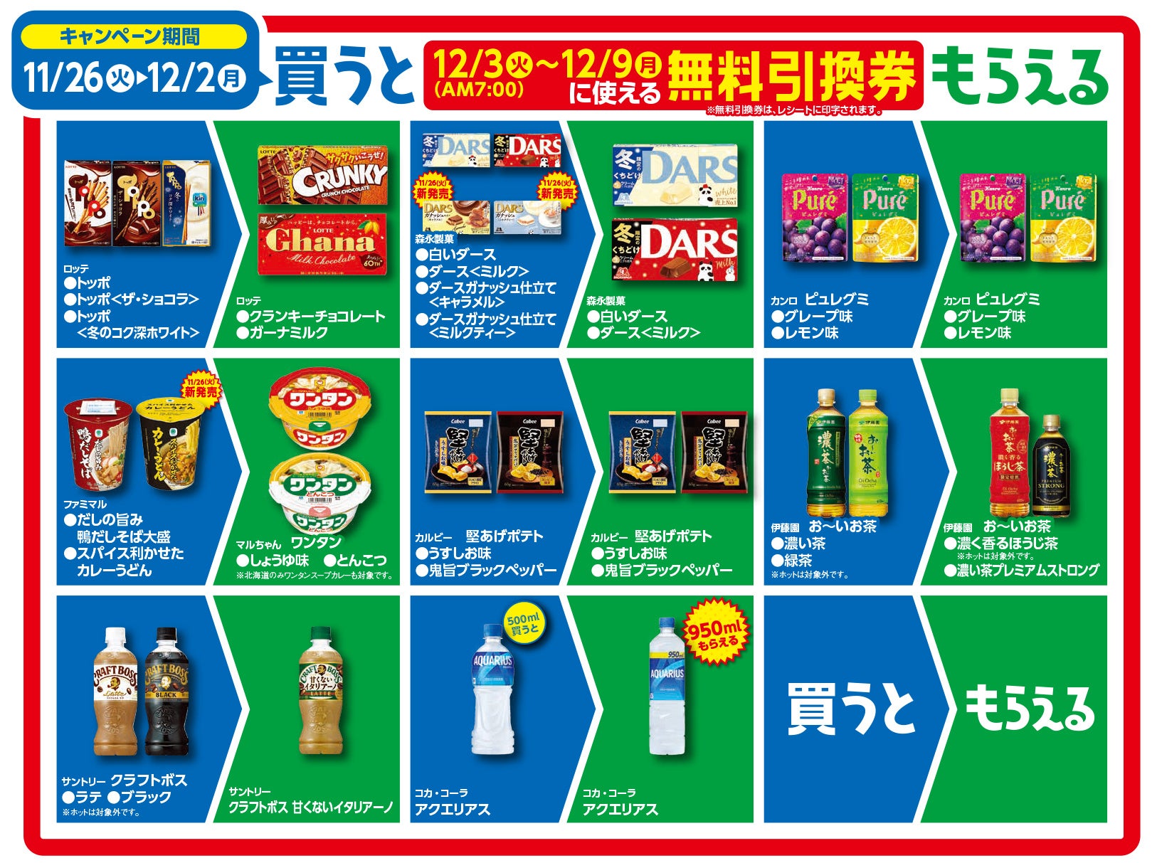 人気商品や新商品などさまざまなカテゴリーを対象とした本キャンペーンは、2021年から実施しており、 多くのお客さまからご好評をいただいております。 11月26日(火)から始まる第2弾では、購入商品よりも大きい容量の商品がもらえる大好評「アクエリアス 500mlを買うと、アクエリアス 950mlがもらえる」ほか、菓子の中でも人気のピュレグミ、さらにはこの時期にぴったりのほうじ茶も無料でもらえるおトクなキャンペーンとなっております。ファミリーマートでのお買い物を楽しんでいただくきっかけとして、この機会にぜひ「たのしいおトク」なキャンペーンをお楽しみください。