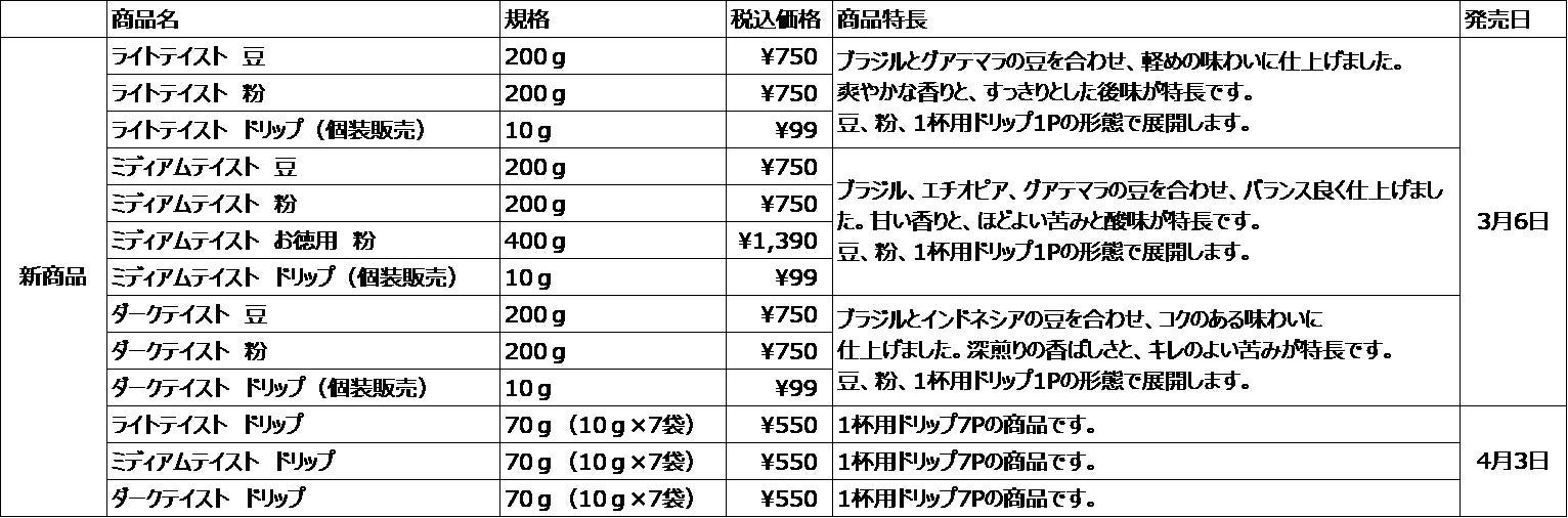 「ライトテイスト」はブラジルの豆に、爽やかな香りが特徴的なグアテマラの豆をブレンドし、軽めの味わいに仕上げています。「ミディアムテイスト」はブラジル、グアテマラの豆に、フルーティーな甘めの香りが特徴的なエチオピアの豆をブレンドし、ほどよい苦みと酸味のバランスが取れた味わいになっています。「ダークテイスト」はブラジルの豆に、深みのあるコクが特徴的なインドネシアの豆を合わせ、深煎りの香ばしさを感じる味わいです。