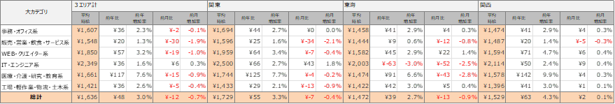 各エリアの平均時給について、関東エリアは1,729円(前年比55円増、前月比7円減)、東海エリアは1,472円(前年比39円増、前月比13円減)、関西エリアは1,529円(前年比63円増、前月比2円増)となりました。