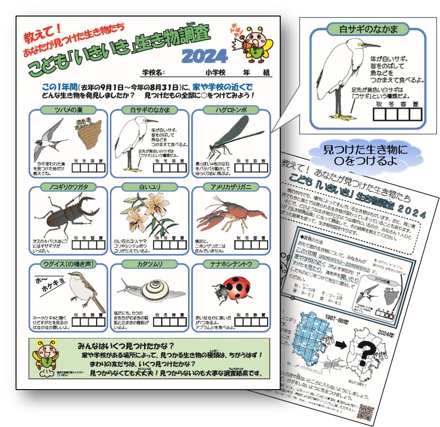 2024(令和6)年は、164校、10,188人の小学生が回答し、水辺の鳥である白サギの確認率が増加していることなど、今後の生物多様性保全に資する貴重な情報を得ることができました。