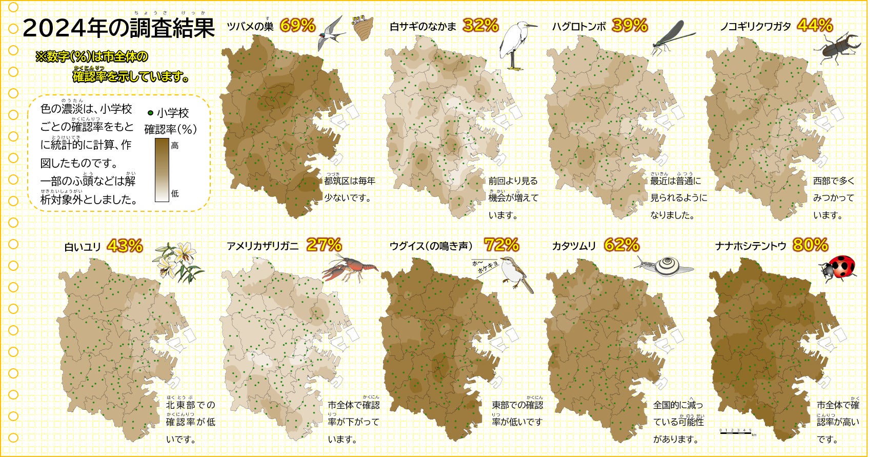 学校ごとに、対象の生き物を見つけた人の割合(以下、確認率)を集計し、その情報をもとに市内全域における確認率の高低を色の濃淡で表示しています。