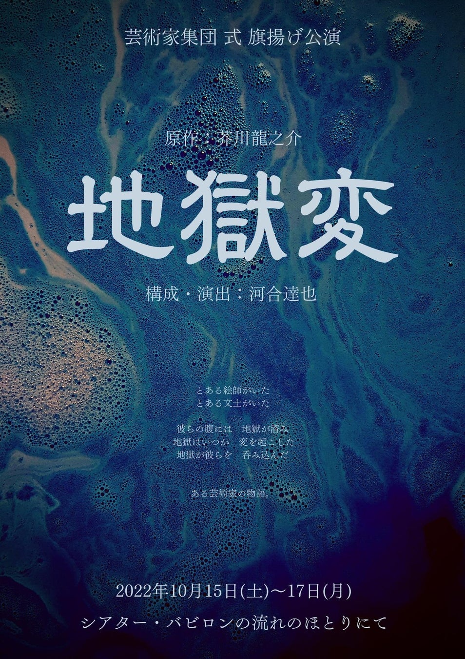 芸術家集団 式(主宰:河合達也)主催、芸術家集団 式 旗揚げ公演『地獄変』が2022年10月15日 (土) ~2022年10月17日 (月)にシアター・バビロンの流れのほとりにて(東京都北区豊島7-26-19)にて上演されます。