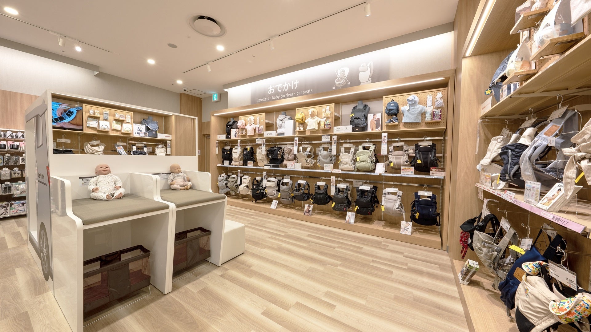 3号店目となる「アカチャンホンポ ららぽーと安城店」は、1号店目、2号店目に続いてCCCにて空間デザインを監修したほか、CCCの店舗づくりのノウハウを活かし、商品を魅力的に展開する什器や、お客さまを誘導する店舗内サイン、サイネージを活用した商品訴求など、店舗を訪れるお客さまにとって分かりやすい売場づくりを行いました。また、商品展開においても旅行やおでかけ、おうちでのくつろぎ、食育、ギフトなど、赤ちゃんのいる暮らしのシーンに応じた提案性を高めた展開を実現しています。