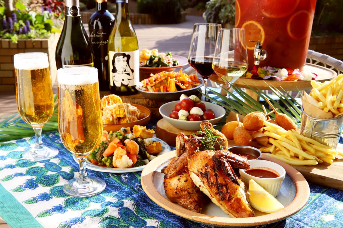 約10種類以上のデリとサラダビュッフェ。お酒には欠かせないフリットやお食事系アテのピザとパスタ。食欲そそるお料理の数々についつい手が伸びてしまう。選べるメインは、ローストチキン・グリルコンボ・黒毛和牛グリルステーキ&グリルチキンよりお選びいただけます。