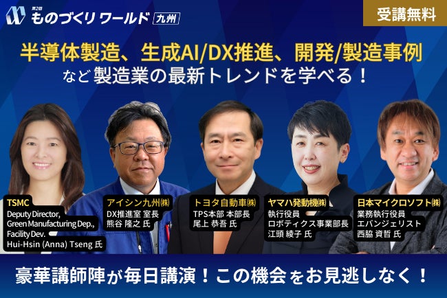 追加登壇が決定したTSMCをはじめ、トヨタ自動車/アイシン九州/日本マイクロソフト/ヤマハ発動機/BYD/IHI/ホンダ/デンソー/SUBARU/鴻海/M2X/Phoxter などが登壇! 製造業の生成AI活用・DX推進をはじめ、開発・製造事例について先進企業の取組みを詳しく学べます。更に海外企業の「半導体・EMS製造」や「EV戦略」の最新動向や、「設備保全DX」「カーボンニュートラル」「AM技術」など、課題に合わせて学べるセミナーを多数開催。製造業の最新トレンドを学べるまたとない機会をお見逃しなく!