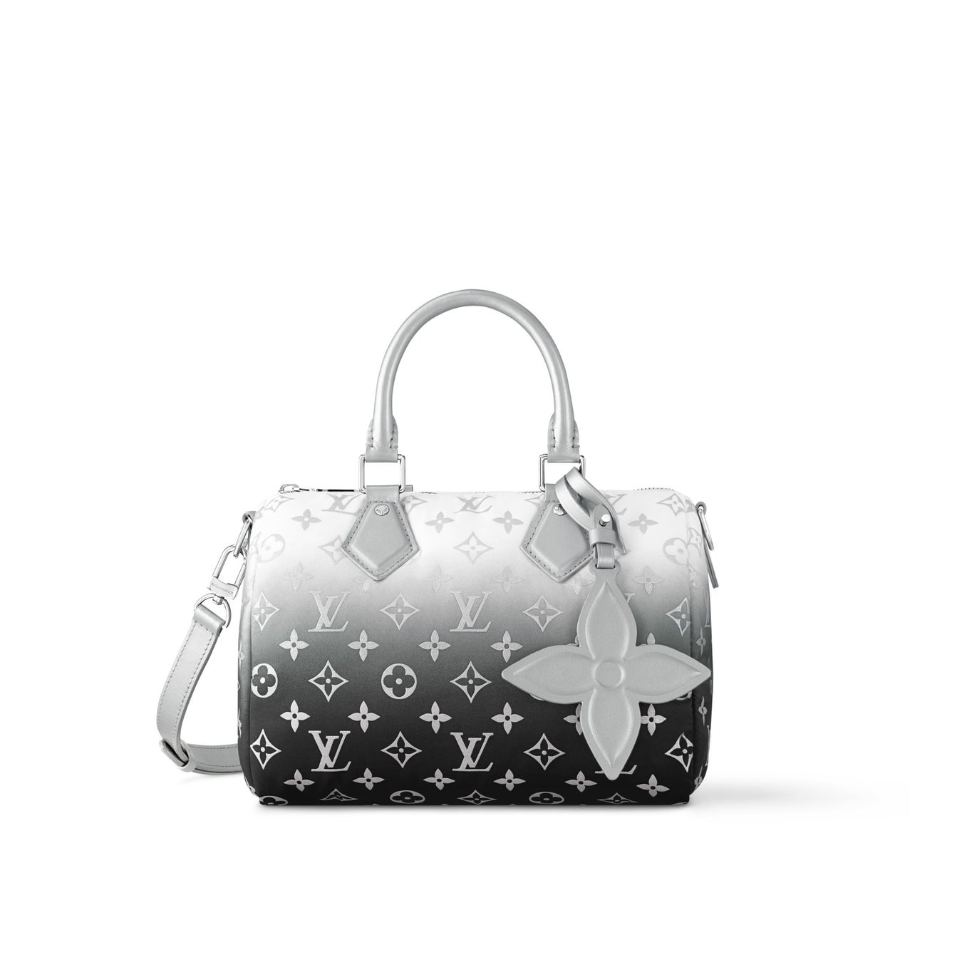 「LV スノー」カプセル·コレクションの一部である「スピーディ·バンドリエール 25」。メゾンの新たなモノグラム·ナイロンにシルバーカラーでグラデーションを効かせました。コンパクトなスタイルを、シグネチャーのフラワーチャームやシルバーカラーのメタルパーツが引き立てます。スマートフォンや財布、鍵などの必需品を収納できるサイズも魅力です。さまざまな持ち方を楽しめる取外し & 調節可能なストラップ付き。