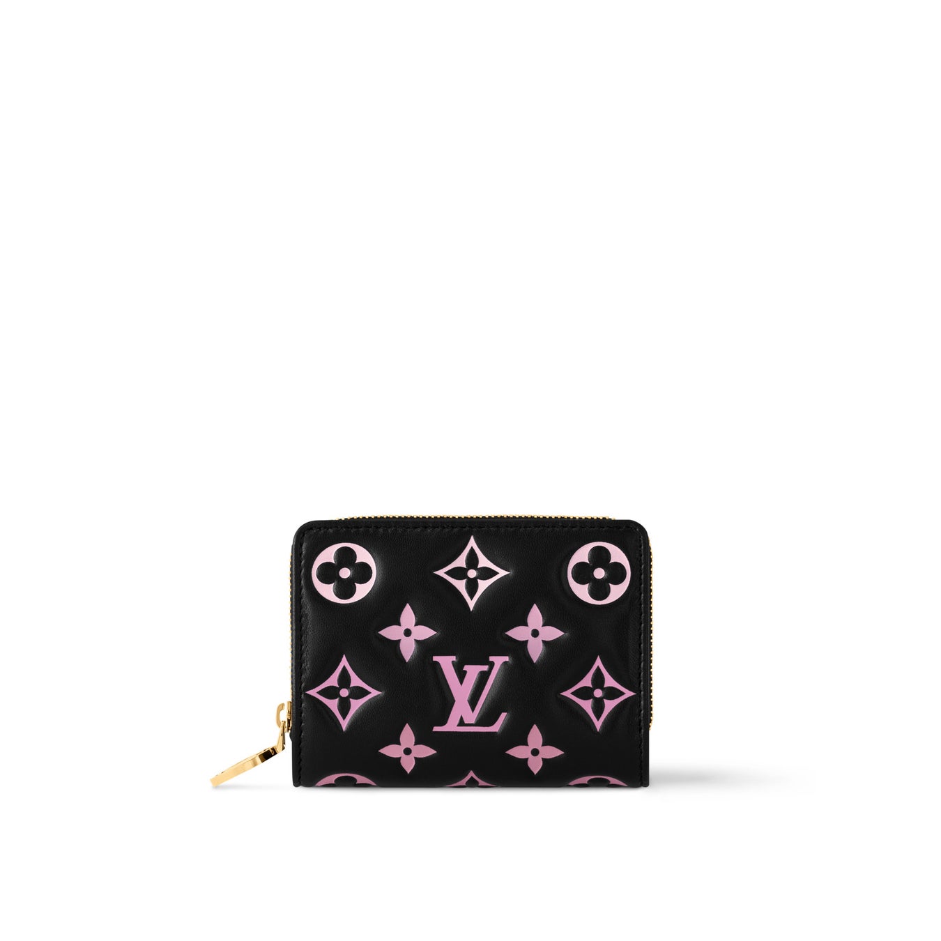 シグネチャーのモノグラム·パターンをエンボス加工で施したパフ感溢れるラムレザーに、洗練されたゴールドカラーのメタルパーツでアクセントを効かせました。6つのカードスロットとファスナー付きコインポケット、紙幣用のオープンコンパートメントを備えたコンパクトながら機能的な内装も魅力。
