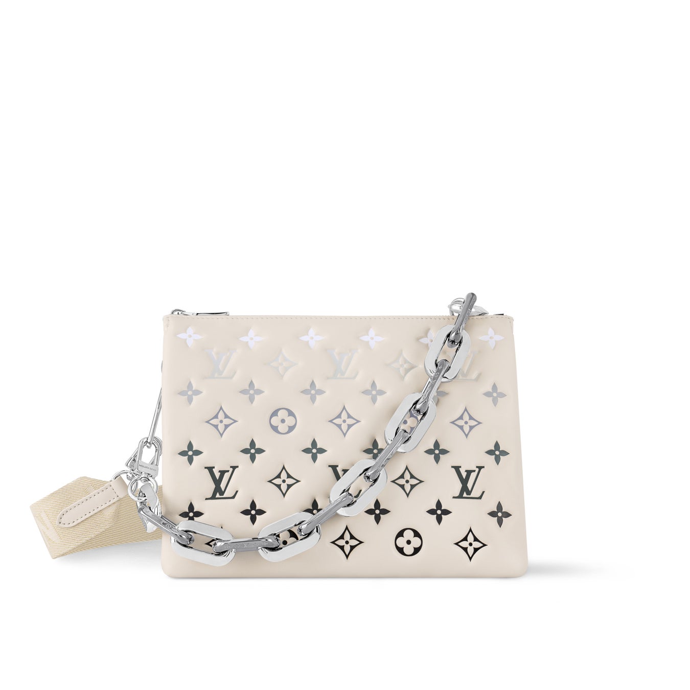「LV SKI」コレクションのためにデザインされた、山にもぴったりな「クッサン BB」。アフタースキーのドレスコードを引き立てるデザインです。メゾンを象徴するモノグラム·パターンをエンボス加工したラムレザーに、今シーズンのプレタポルテとマッチする新たなグラデーションを効かせました。ガルバナイズド加工を施したバイカラーのチャンキーなチェーンが大胆なステートメントを放ち、取外しも可能です。