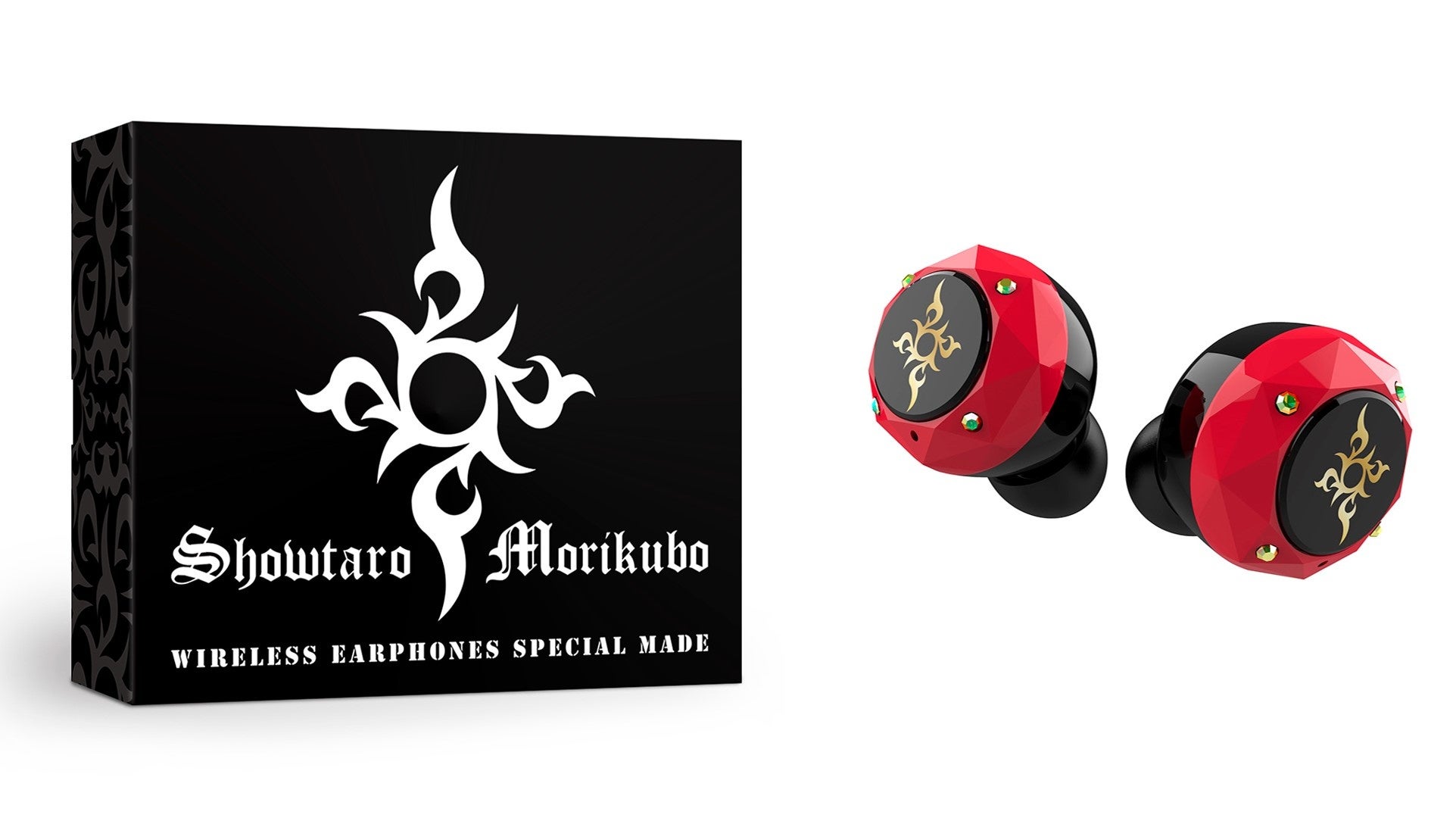充電ケースにはファンにはお馴染みのトライバルマークが描かれ、ブラック×レッドのロックな配色のイヤホンには角度によって見え方が異なるオーロラストーンがあしらわれています。