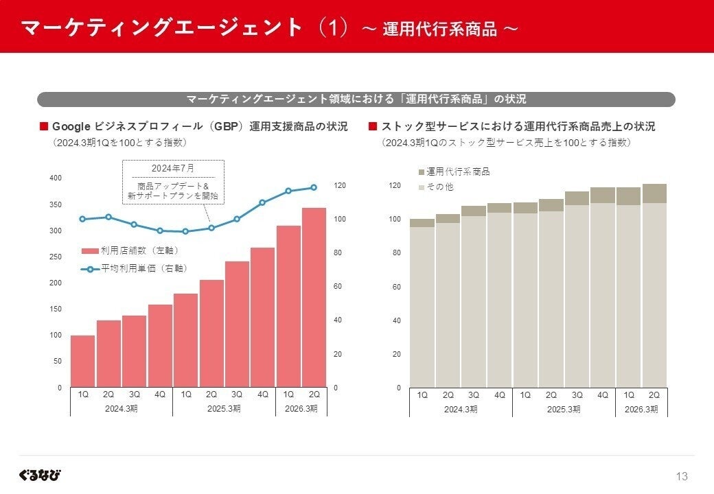 マーケティングエージェントサービスのうち、GBPをはじめとする各種ツールの運用を代行する商品は、人手不足で各種ツールの運用にあてる時間を確保できない飲食店の課題やニーズを捉え、ストック型売上の成長を牽引する存在へと育ちつつあります。