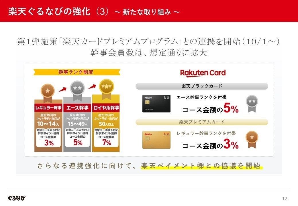 ブラックカード会員様にはコース金額の5%分、プレミアムカード会員様には3%分の楽天ポイントを進呈するという、「楽天ぐるなび」のネット予約ならではの非常にお得な制度となっています。つきましては、まだ楽天IDとぐるなびIDの連携がお済みでない楽天カード会員の皆さまにおかれては、この機会にぜひIDを連携いただき、「楽天ぐるなびネット予約」をご利用いただき、よりお得に楽しく外食にお出かけいただければ幸いです。