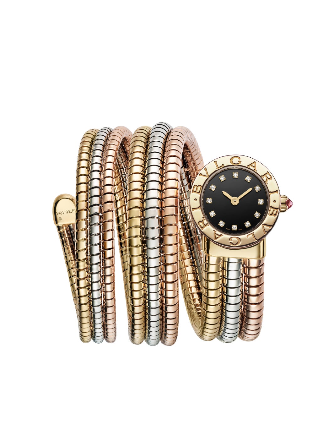 イタリア語で「ガス管」を意味するトゥボガスは、1920年代にガスを高圧輸送するために使用されていた管をモチーフとしています。工業的機能性と芸術的な優雅さが重なり合い、職人の優れた技巧によりアールデコの美学と機械的デザインの双方が見事に融合しました。1940年代、当時すでにジュエリーの世界で広くその名が知られていたブルガリはその卓越した技術からトゥボガスの技法を生み出しさらなる進化へと歩みを進め、蛇を想わせる曲線とその頭に時計を冠したタイムピースへと繋がっていきました。またブルガリは類まれなる技術によりピンク、イエロー,ホワイトの3種のゴールドが調和する革新的な美しさをチューブ型のバンドにより表現し、「ミニ トゥボガス」という名の3種のメタルから成る精巧かつ洗練されたブレスレットが誕生しました。