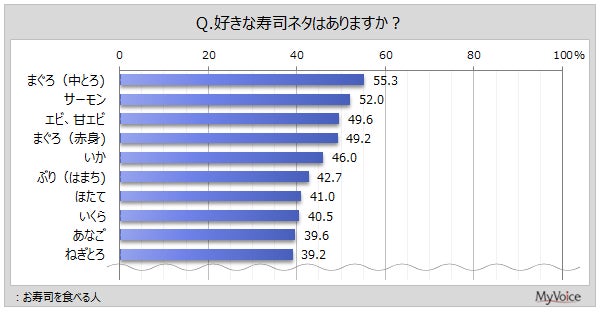 お寿司を食べる人が、好きなネタは(複数回答)、「まぐろ(中とろ)」「サーモン」が各50%台、「エビ、甘エビ」「まぐろ(赤身)」「いか」などが各40%台です。