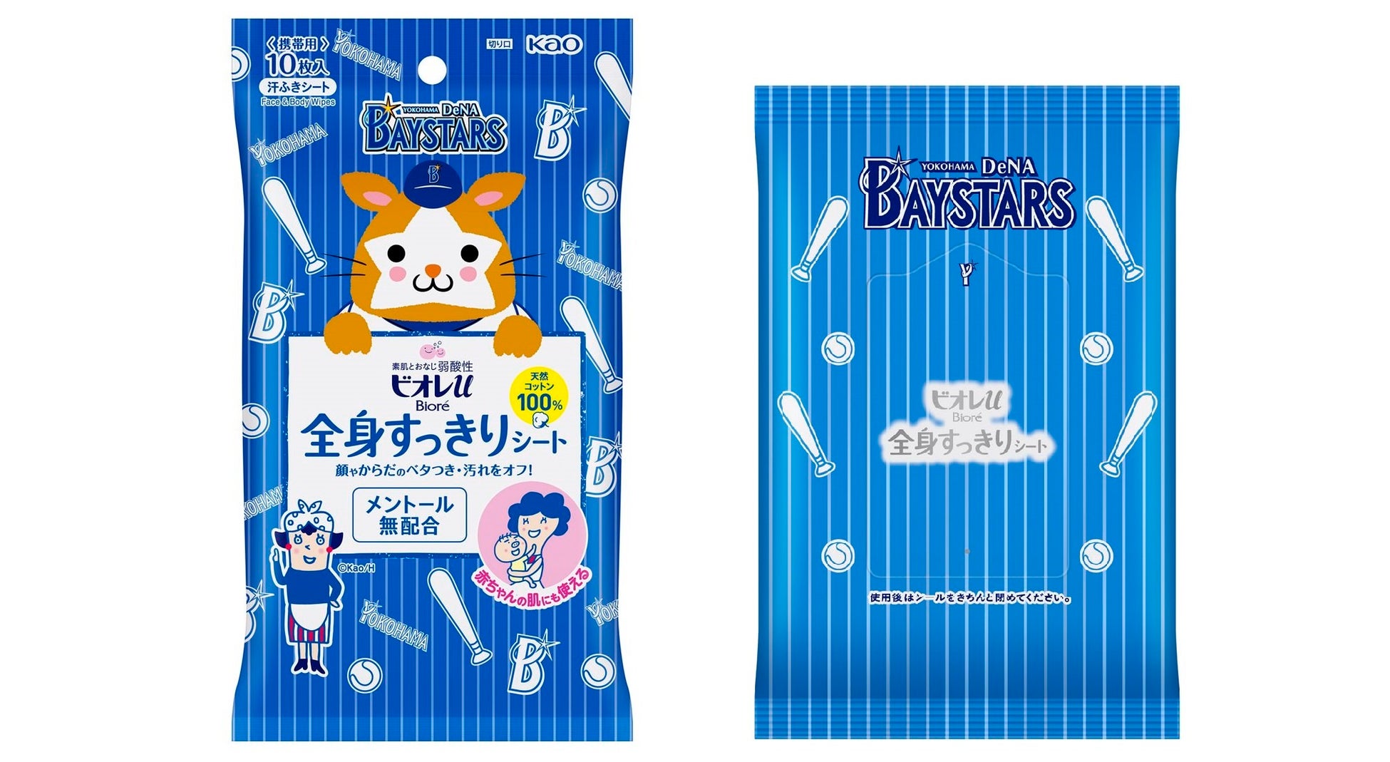 今年は、野球観戦をはじめとする外出先での快適を提案したいという想いのもと、「ビオレu 全身すっきりシート」から「横浜DeNAベイスターズデザイン」を発売します。球団の公式マスコットキャラクター「DB.スターマン」をあしらった、お子さまにも手に取っていただきやすいオリジナルデザインです。厚手のシートで、顏やからだの汗やベタつき、汚れをすっきりふきとり、肌荒れを予防します。界面活性剤不使用、無香料、メントール無配合のトリプルフリー設計。素肌とおなじ弱酸性。赤ちゃんの肌にもお使いいただけます。