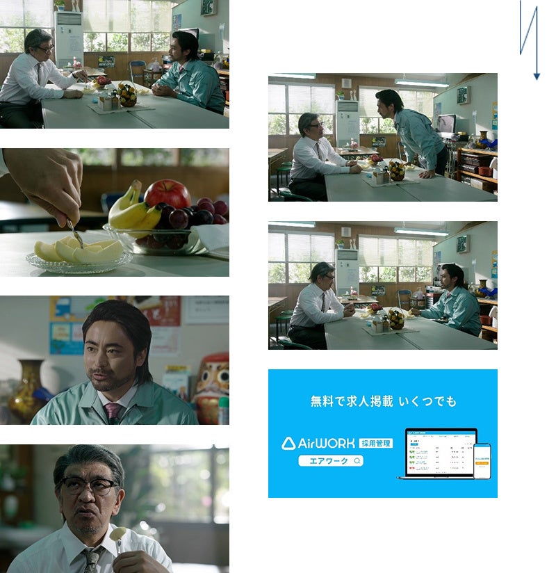 今回のCMは、会社の談話室が舞台。談話室でリンゴを食べながら休憩をしている松本社長と山田さんですが、ふと松本社長が「山田君はどうして営業やりたかったんです?」と尋ねます。「ぶっちゃけ、会社と社長のことを好きになれたので、部署は二の次と言いますか…」と少し照れたように答える山田さんに対して「ふーん、じゃあ経理は?」「人事は?」と畳みかけるように尋ねる松本社長。「経理? 面白そうじゃないですか!」「人事? いいじゃないですか‼」とだんだんヒートアップしながら答える山田さん。次に松本社長が「デザイナーは?」と言おうとすると、山田さんはさえぎるように「デザイナー? 最高です‼」と、熱くなりすぎて思わず立ち上がってしまいます。落ち着きを取り戻し「え、なんで採用ページに載せなかったんですか?」と少しあきれた顔で尋ねる山田さん。「知らんかったんや。いくつも載せられること…」とうつむき加減で答える松本社長は、すぐさまその雰囲気から逃げるように「リンゴ食べよ?」とポツリ。微妙な“間”の後に二人とも無言でリンゴを食べるという、コントのような休憩中の一幕となりました。