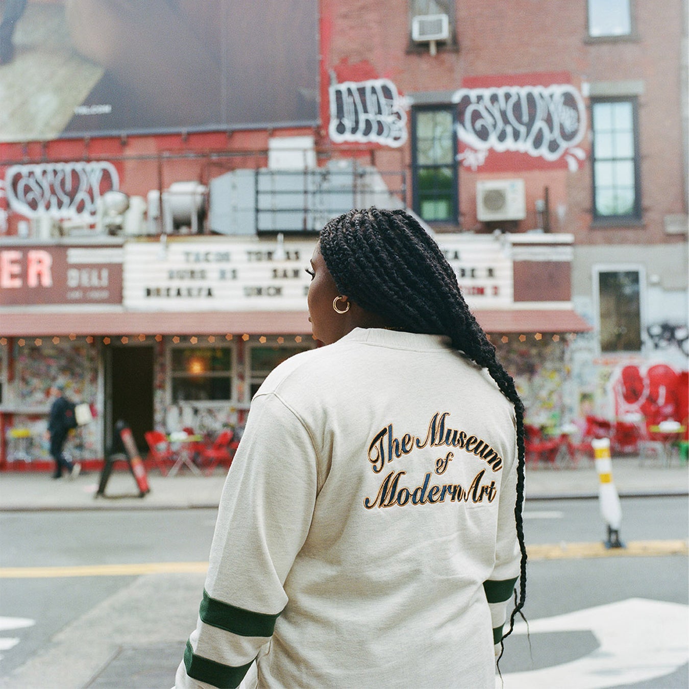 ヴィンテージのレターマンスタイル(大学の頭文字を大きく表示したスタイル)へのオマージュを込めて、Vネック、ストライプを入れた袖、左胸にMoMAのロゴ、背面に「The Museum of ModernArt」の名称をあしらいました。