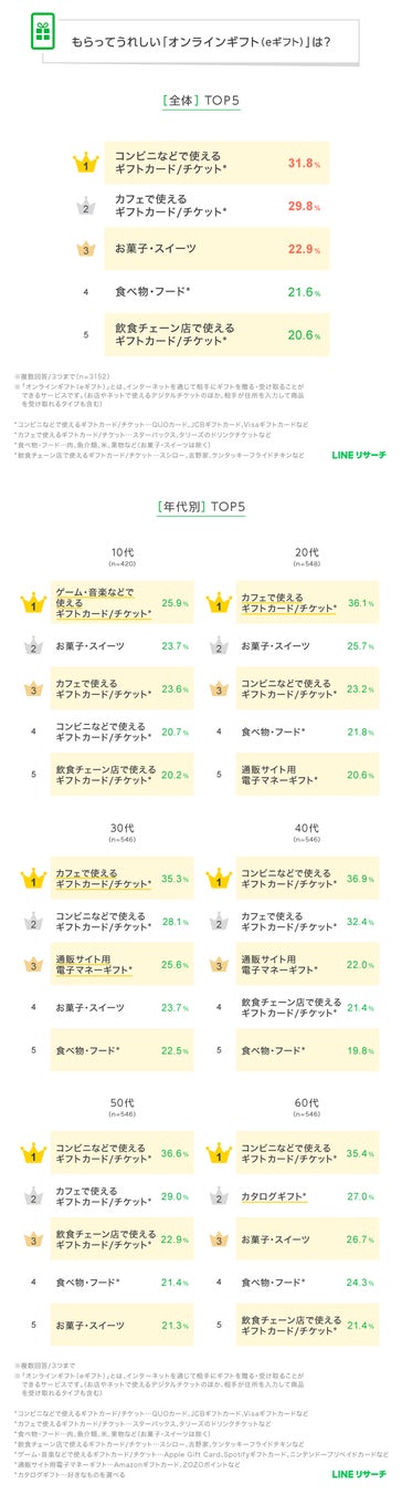 【LINEリサーチ】半数の人がオンラインギフト(eギフト)を贈った経験あり!もらってうれしいのは?10代では"体験型ギフト"が人気