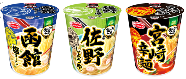 日本縦断ご当地ラーメン巡りをテーマに、全国的に知名度がある北・東・南エリアのご当地ラーメンを新発売します。めん処の北海道から「函館 塩ラーメン」、関東を中心に幅広く人気がある「佐野 しょうゆラーメン」、九州からは全国的にブーム拡大中の「宮崎辛麺」です。