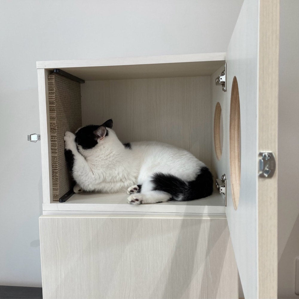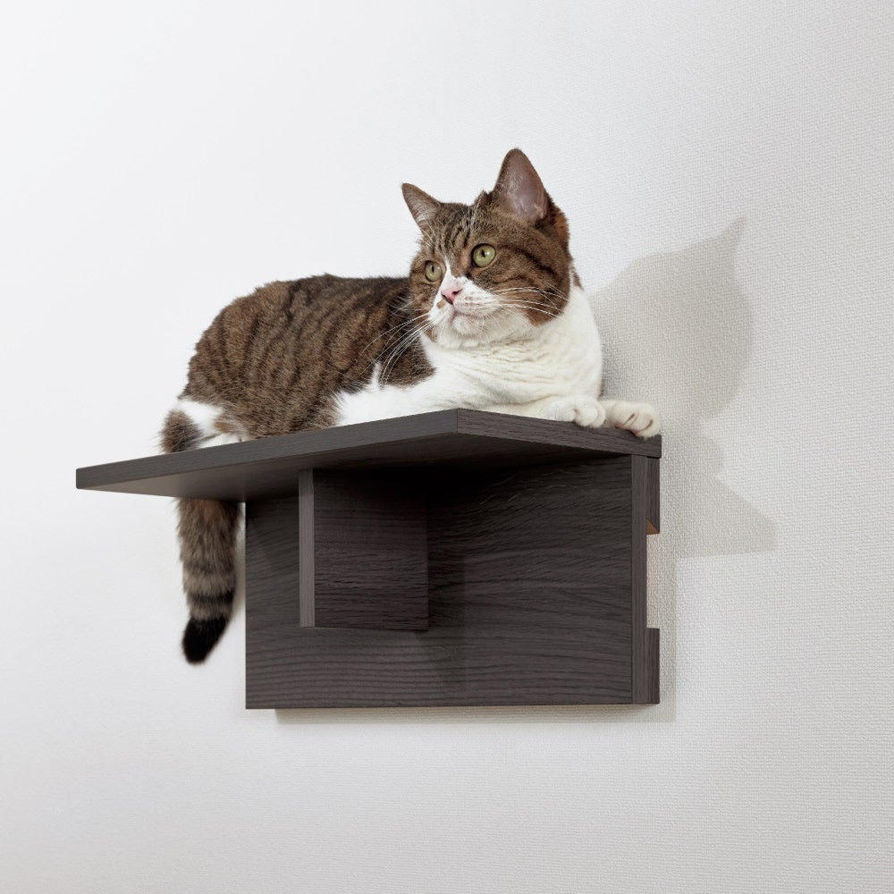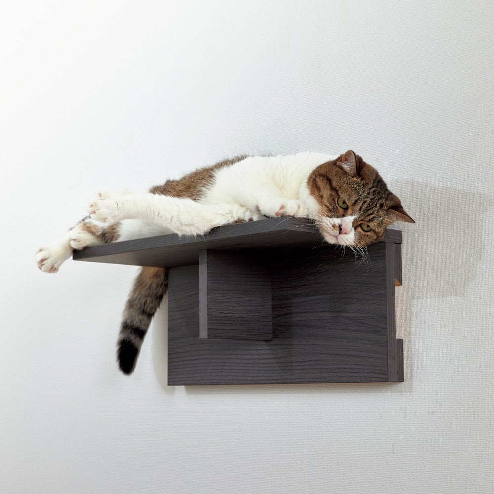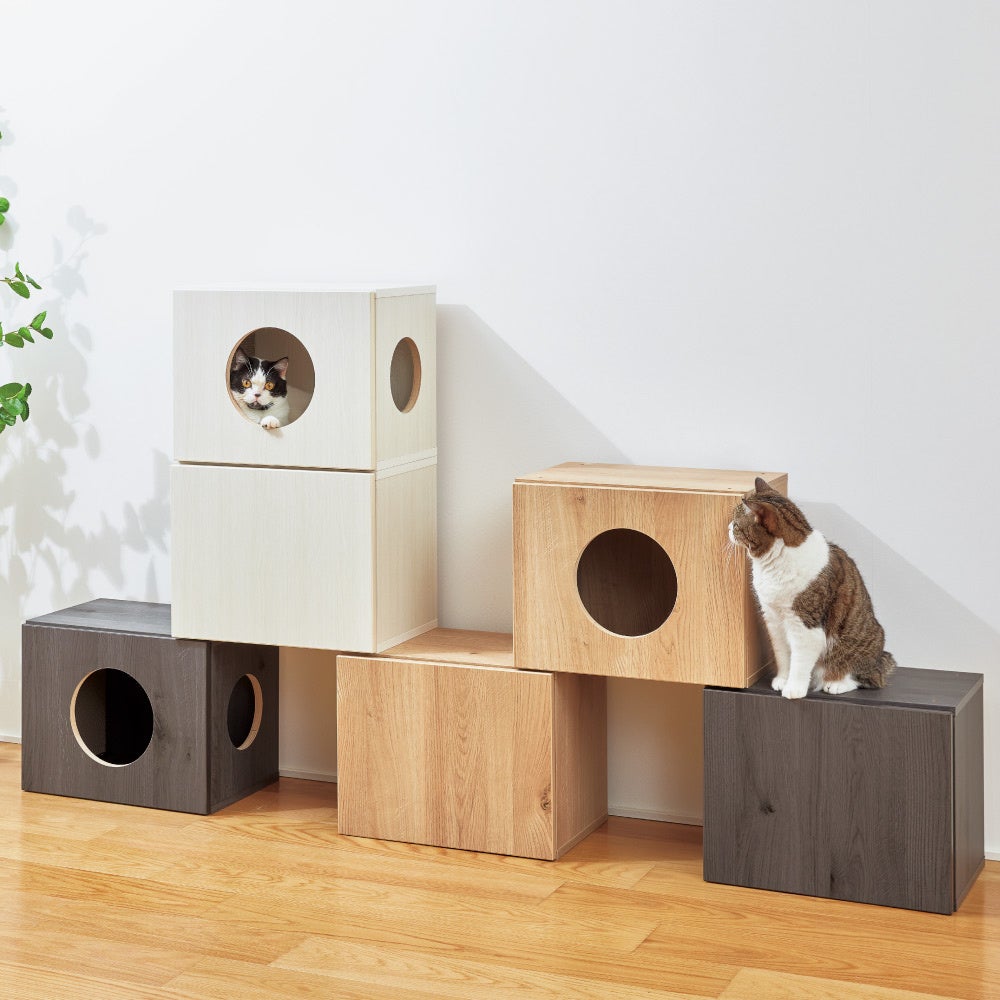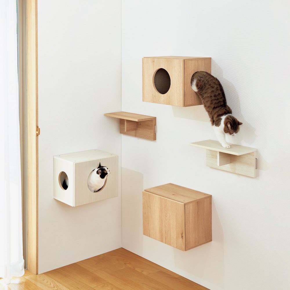 ネコ用タワーを置く場所がない部屋でも、このボックスなら壁に付けるだけなので場所取らず。床に置く場所があるおうちなら、床に置いて複数積み重ねて使うこともできます。階段状に複数台並べて設置すれば、上下運動がしっかりできるので、ネコ用タワー代わりとしても使えます。ネコが入れるキャットボックスタイプ・収納タイプ・キャットステップの3つをお好みで組み合わせることができます。