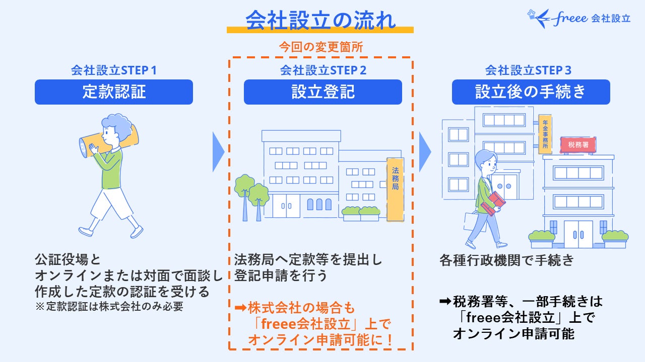 フリー株式会社(本社:東京都品川区、CEO:佐々木大輔、以下「freee」)は、会社設立時に必要な書類を無料作成できるサービス「freee会社設立」について、株式会社設立時の法務局への登記申請がオンラインで完結できる機能を追加したことをお知らせします。