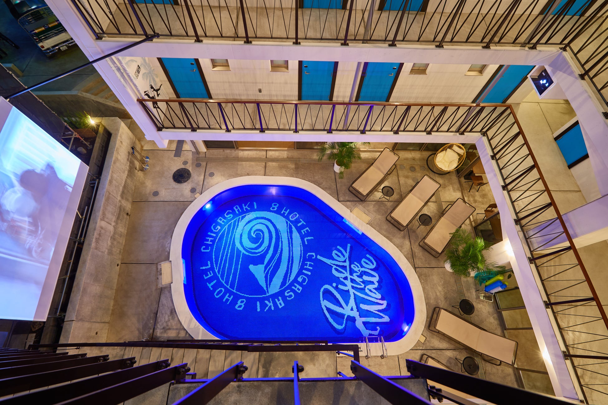 まるで海外にあるモーテルのような造りをした 8HOTEL CHIGASAKI。プールを囲うようにフロント、ラウンジ、サウナなど、非日常な空間が広がります。サウナやプールだけではなく、併設のラウンジで軽食を楽しんだり、ととのいスペースでゆっくり話したり、あなたらしく自由に寛ぎ、チルな時間をお楽しみください。夜はライトアップで別の顔を見せ、ナイトプールとしてもお楽しみいただけます。