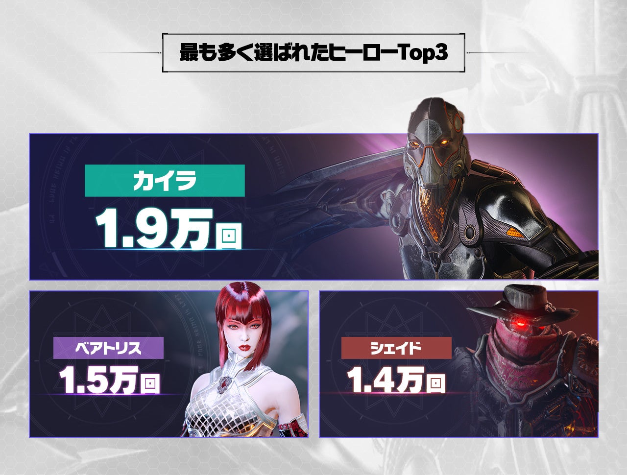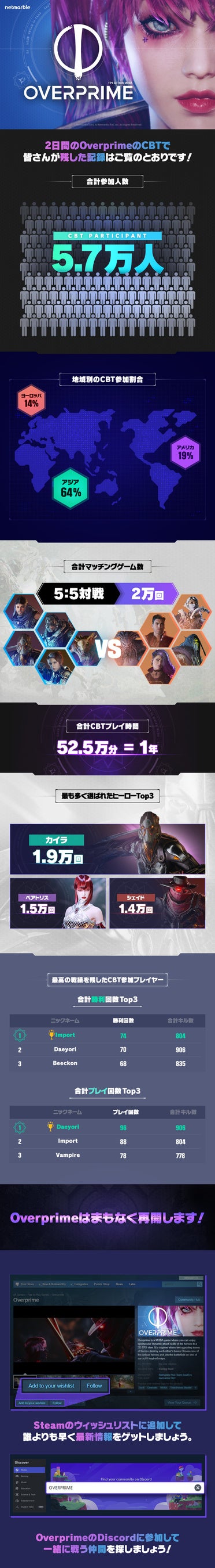 今回発表したCBTの結果は、『OVERPRIME』公式Discordチャンネル内のインフォグラフィックでも確認することができます。最もプレイされたヒーローのトップ3や最高の戦績を残したCBT参加プレイヤーの記録など、『OVERPRIME』への期待感が高まるデータを掲載しています。