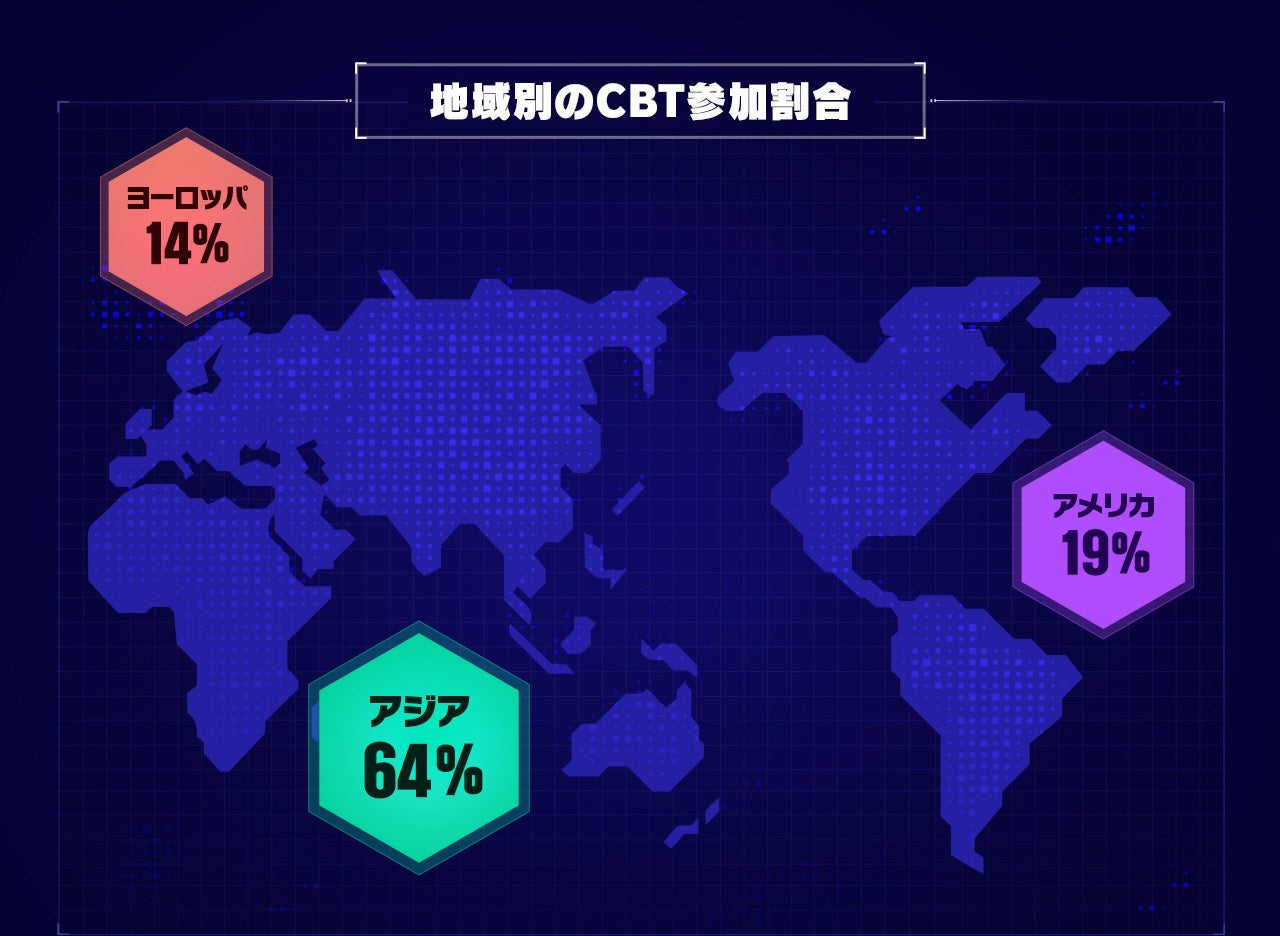 今回のCBTは、世界139ヵ国より57,000人(参加国比率は、アジアが全体の64%(主な参加国は中国と韓国)、北米が19%(主な参加国は米国)、ヨーロッパが14%(主な参加国はロシア))のプレイヤーの皆様にご参加頂きました。