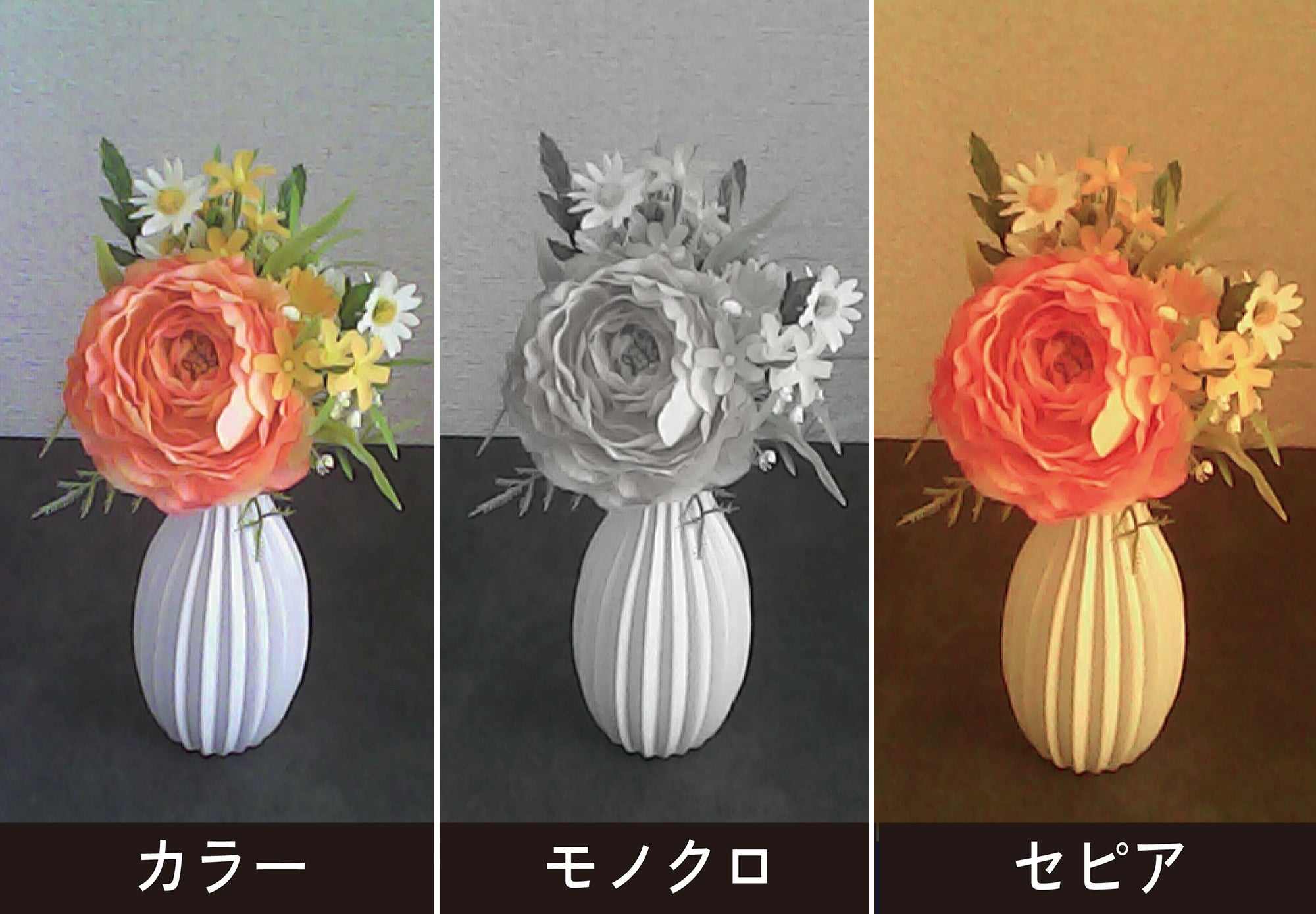 写真はカラー、モノクロ、セピアモードで撮れます。