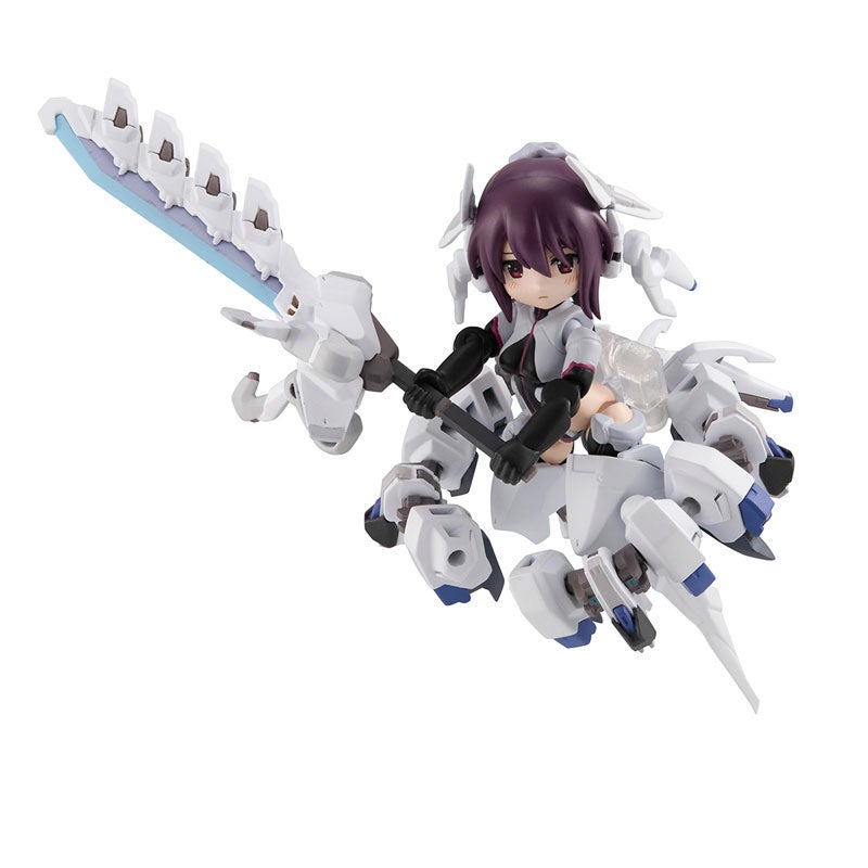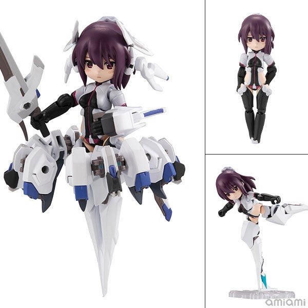 - 80mmにかわいくデフォルメされた彩色済み完成品素体に、バーニア展開ギミックを差し替えで再現した専用ドレスギア「オデットMk3」が組み立てキット状態で付属。