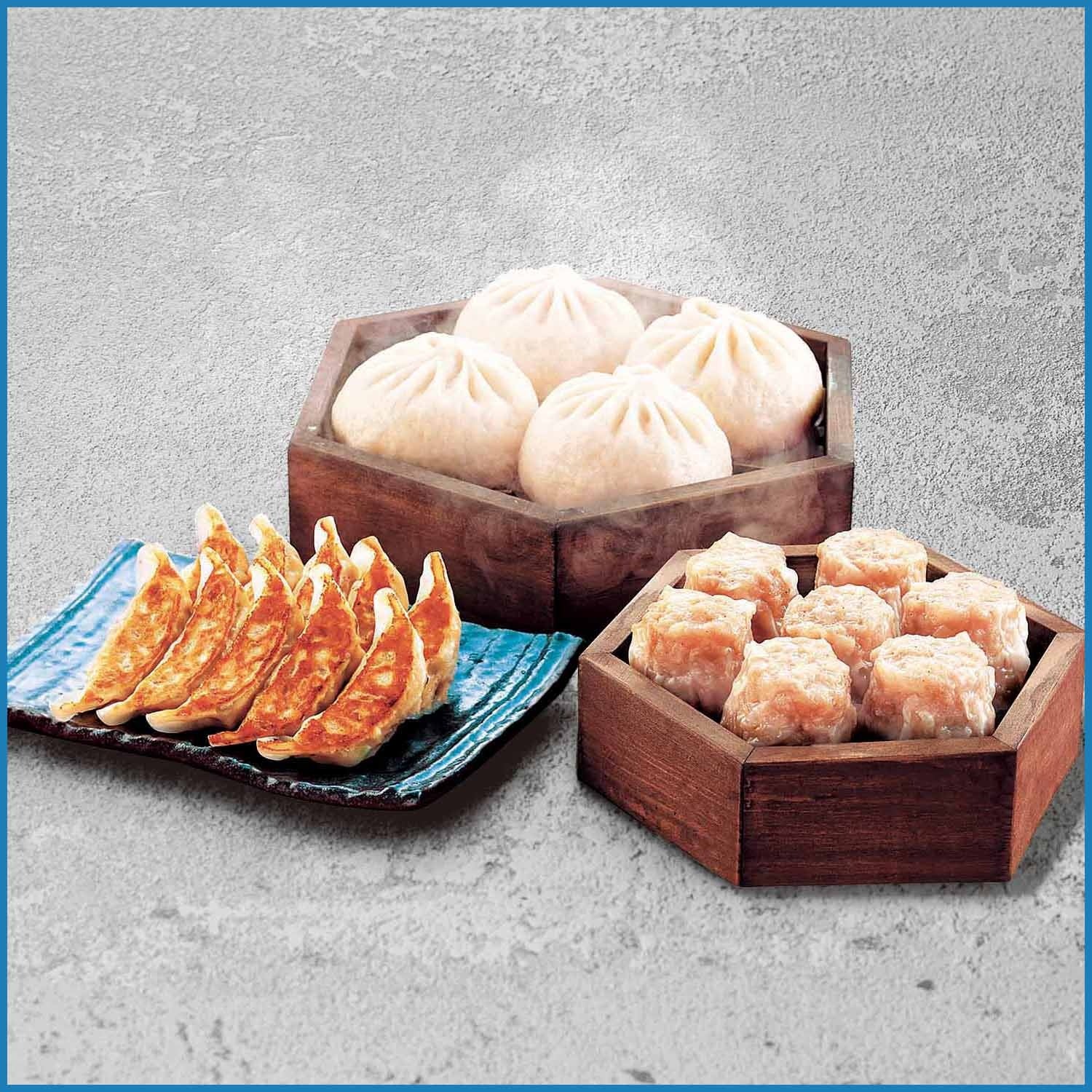 (豚まん6個入、焼売10個入、焼餃子15個入、1セット) 2,550円 実演