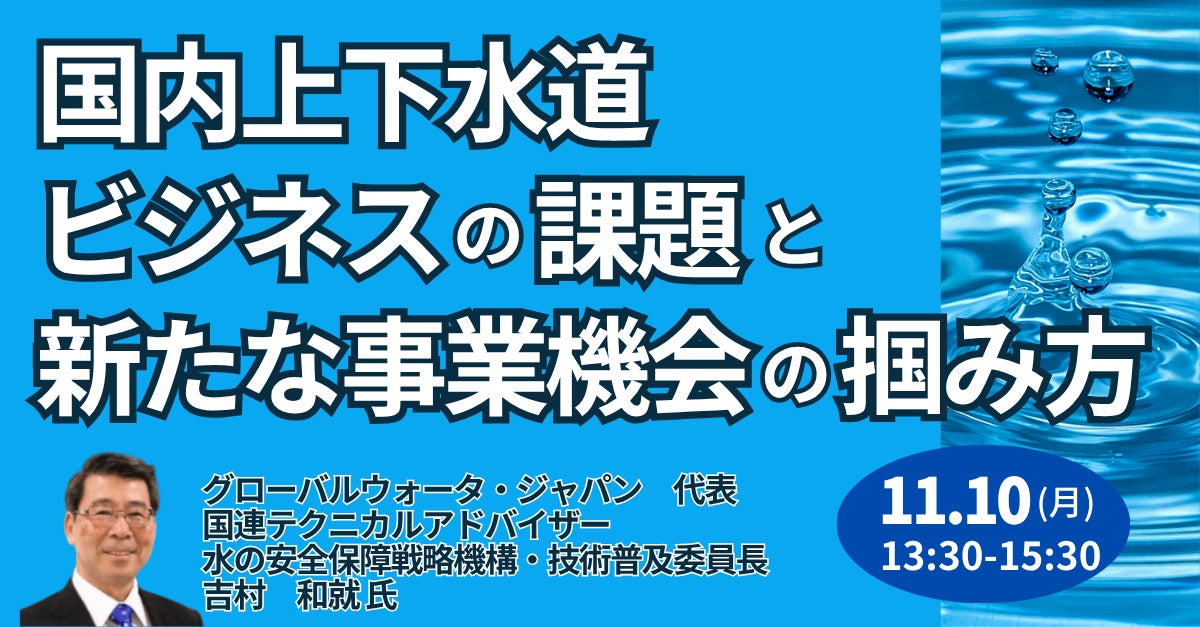 JPI(日本計画研究所)は、グローバルウォータ・ジャパン 代表 国連テクニカルアドバイザー 水の安全保障戦略機構・技術普及委員長 吉村 和就 氏を招聘し、国内上下水道ビジネスの課題と新たな事業機会の掴み方について詳説いただくセミナーを開催します。