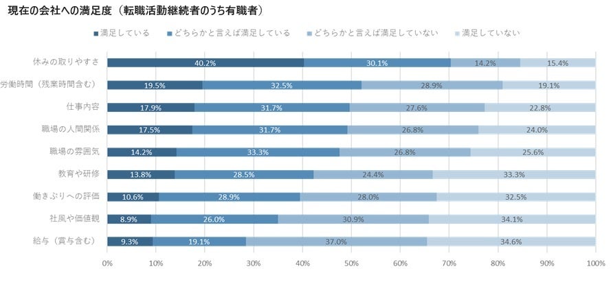 転職活動継続者のうち、現在働いている人に、現在の会社における以下の各項目の満足度について、「満足している」「どちらかと言えば満足している」「どちらかと言えば満足していない」「満足していない」の4尺度で聞いた。