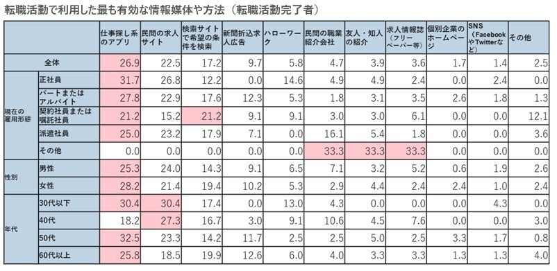転職活動完了者に、その転職活動で利用した情報媒体や方法の中で最も有効なものを聞いた。回答が最も多かったのは「仕事探し系のアプリ」で26.9%、次いで「民間の求人サイト」22.5%、「検索サイトで希望の条件を検索」17.2%、「新聞折込求人広告」9.7%、「ハローワーク」5.8%、「民間の職業紹介会社」4.7%の順になっている。